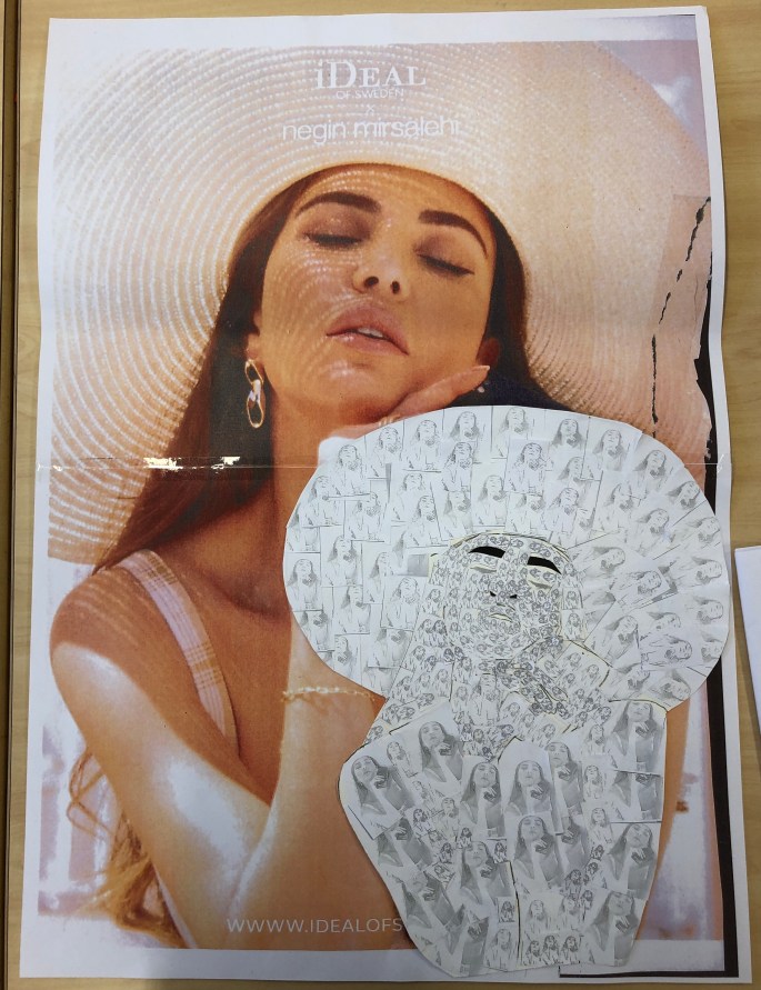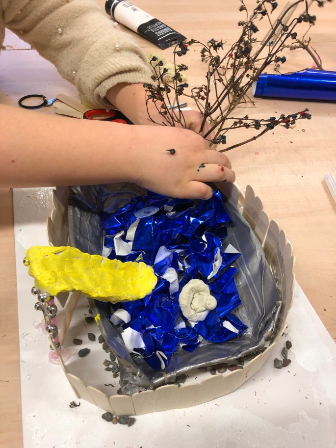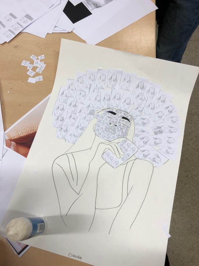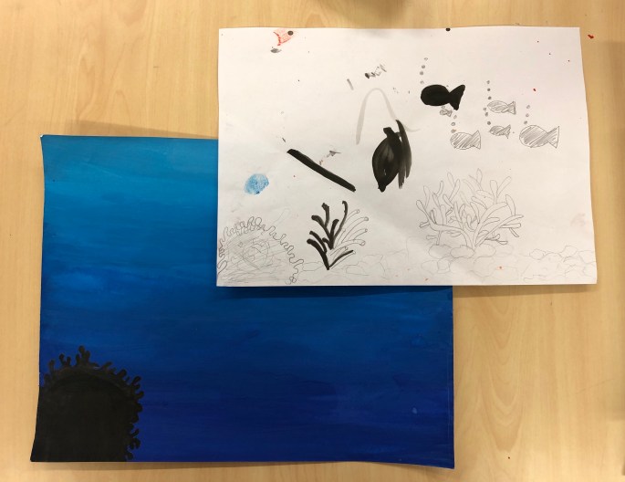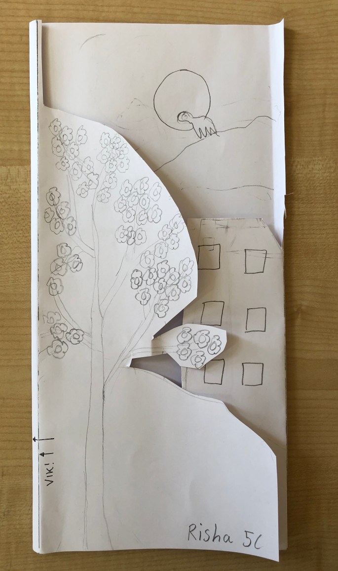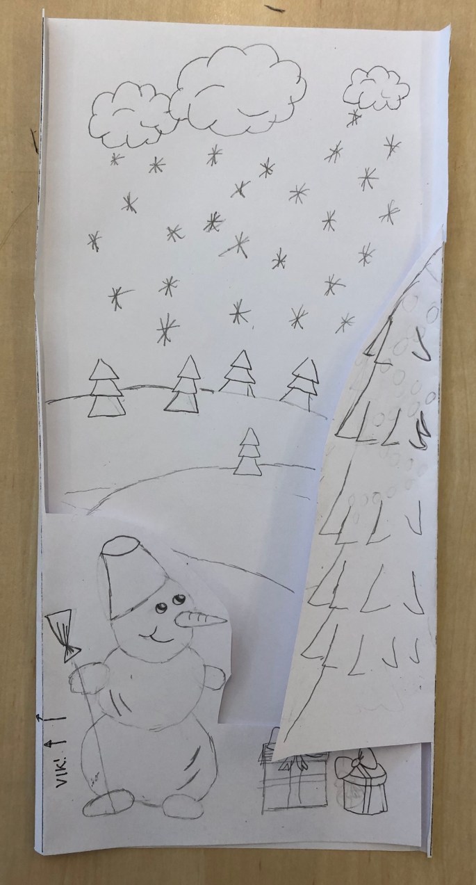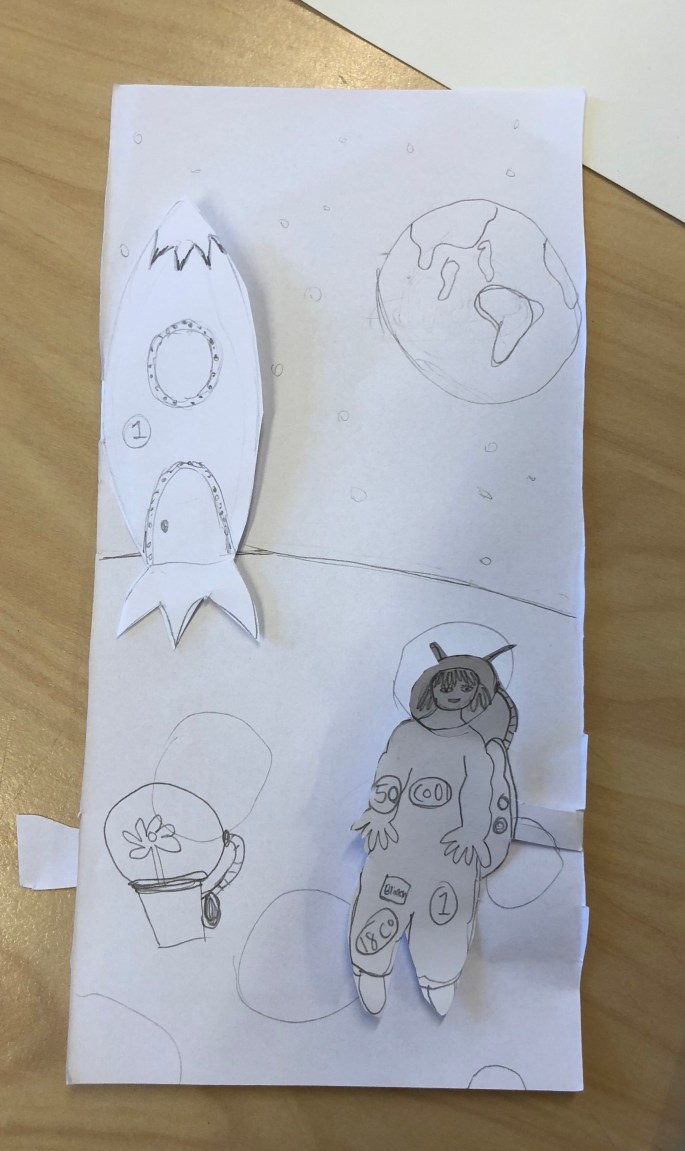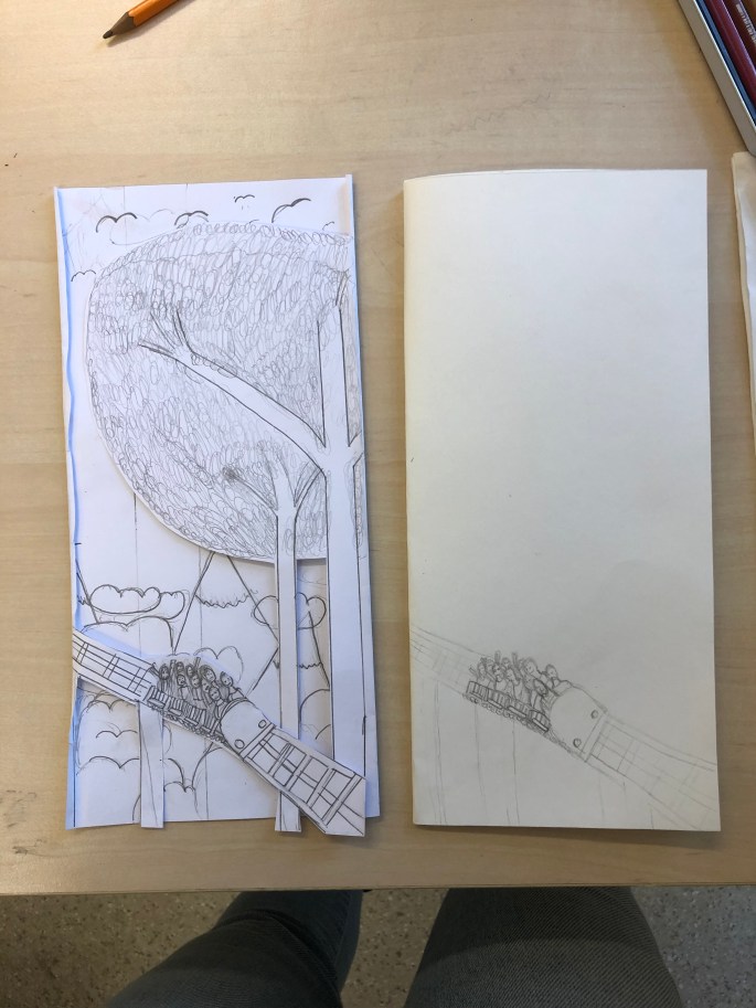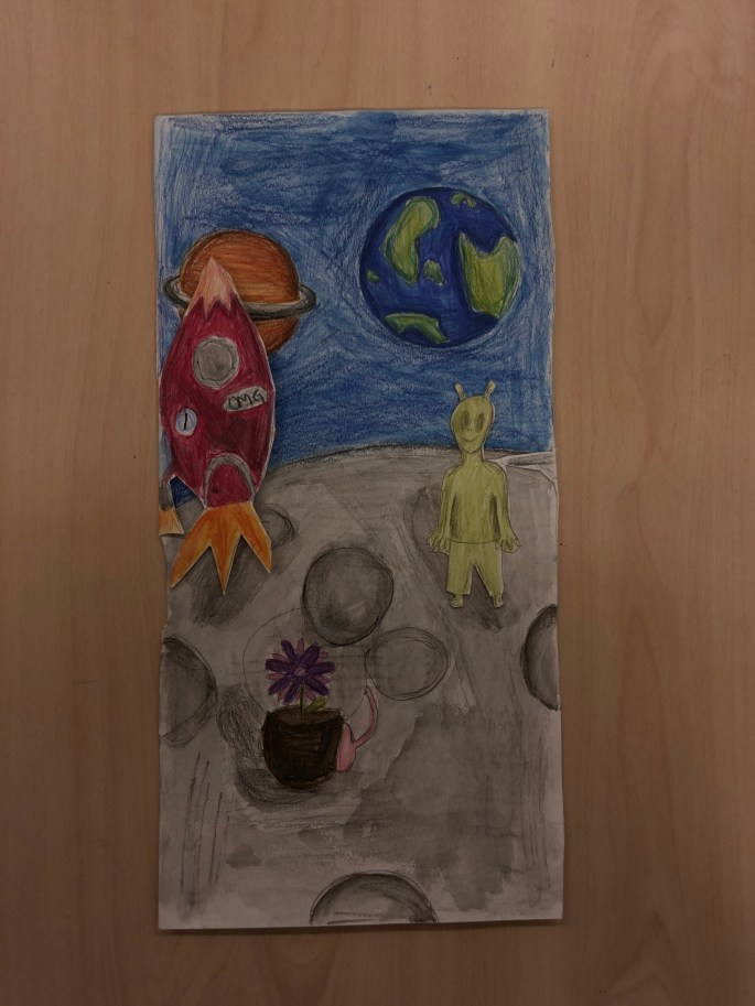 Vi har pratat om djup i bilder. De får välja ett tema tex rymden samt välja hur de ska gestalta en figur, något som växer och något som är byggt. Pappret viks i tre lika stora delar och det som inte behövs/döljer det bakom klipps bort. Vad ska vara i förgrunden? Mellangrunden? Bakgrunden?