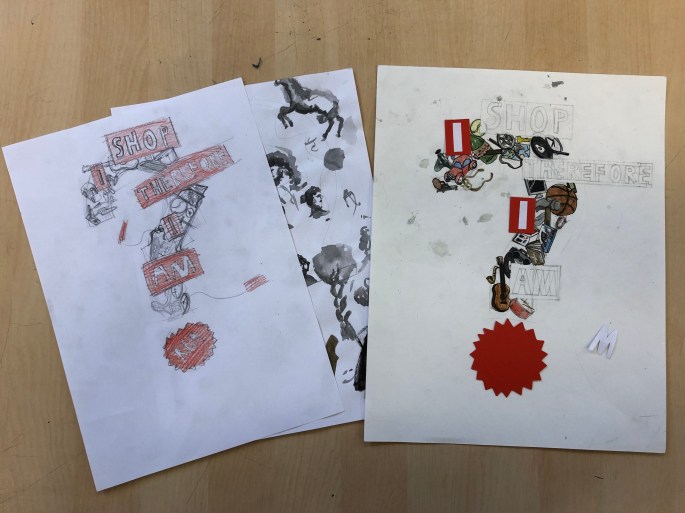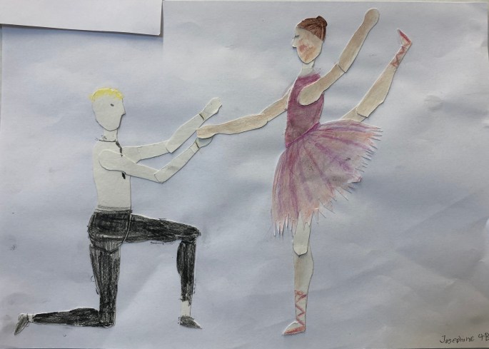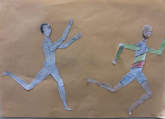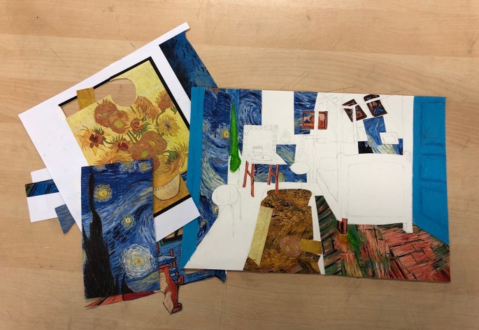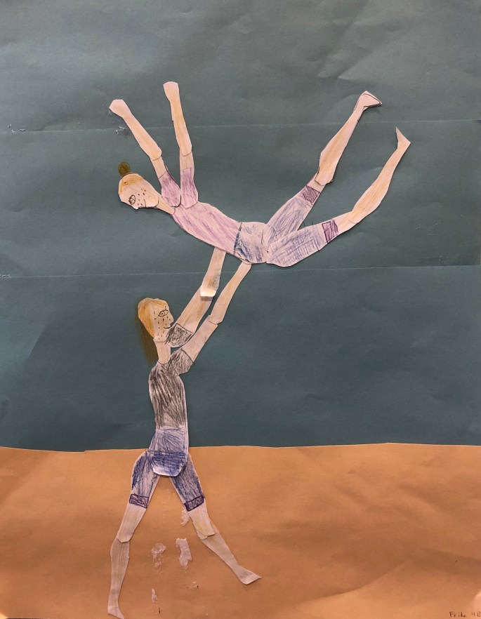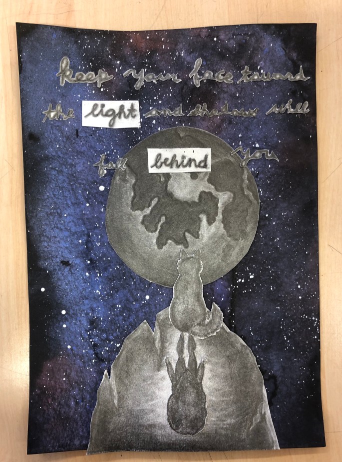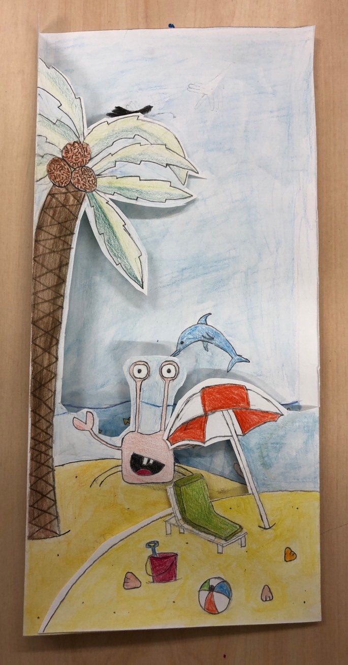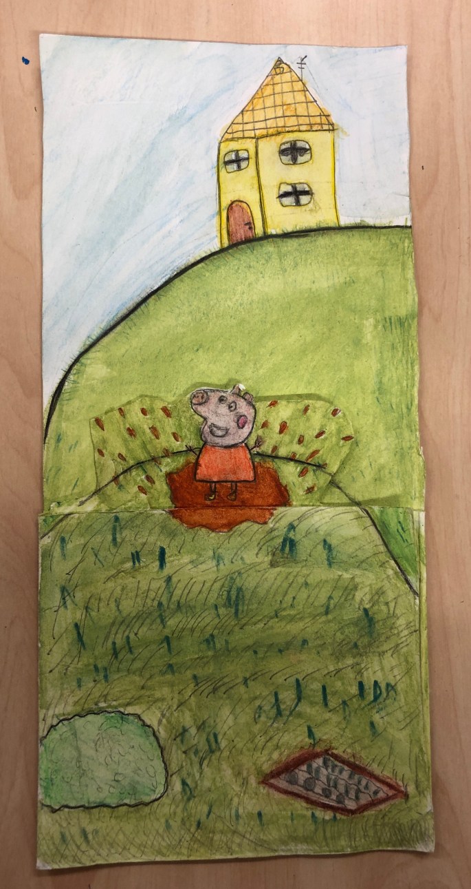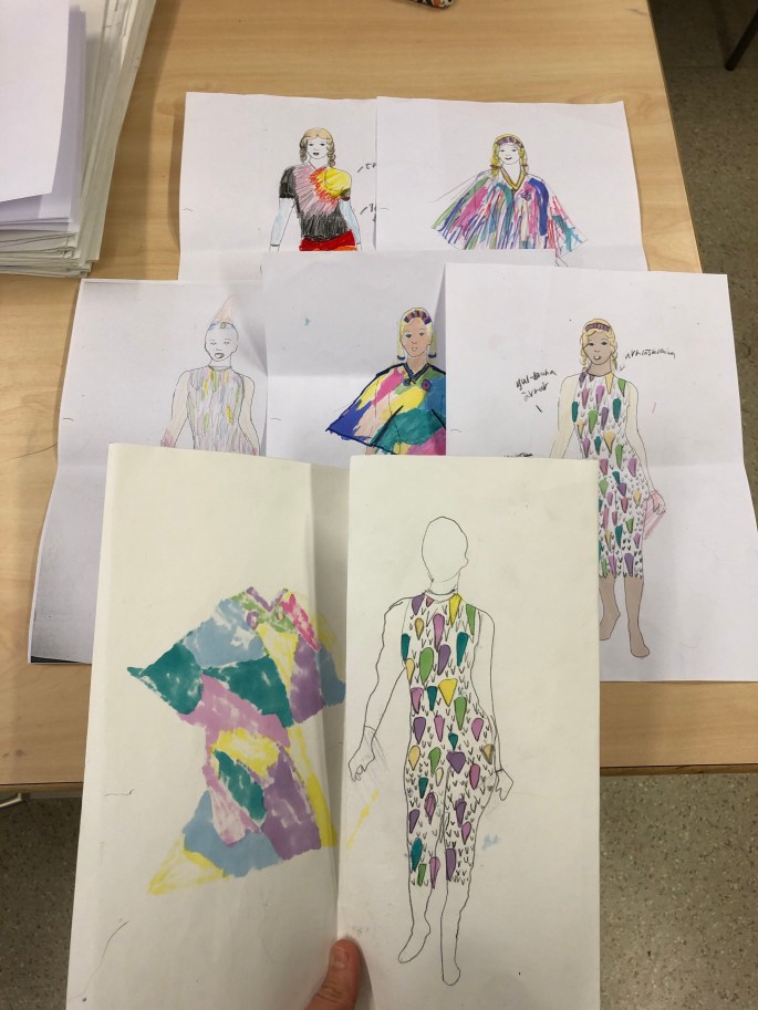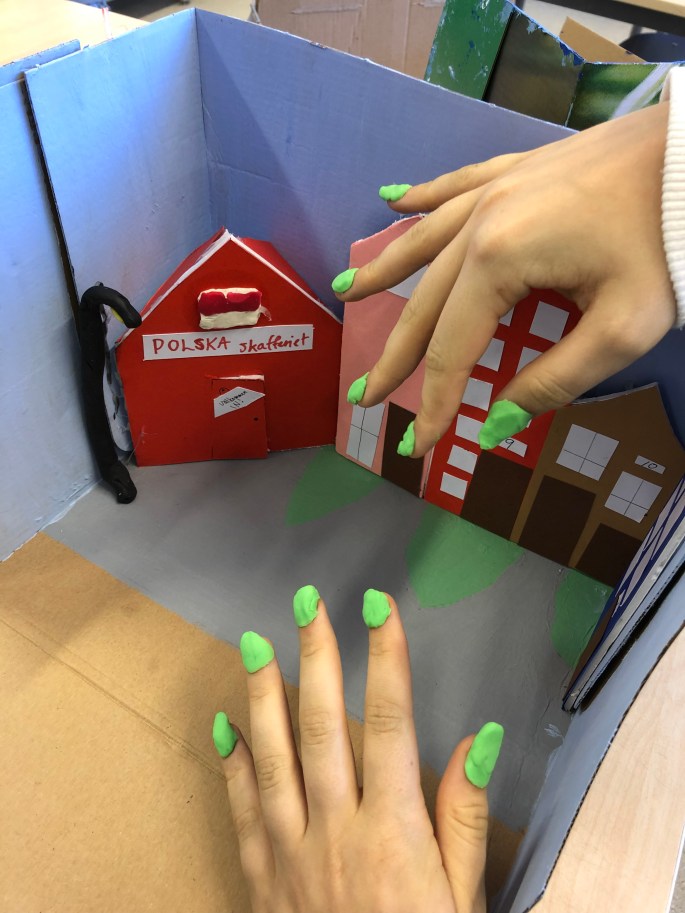Vi har pratat om djup i bilder. De får välja ett tema tex rymden samt välja hur de ska gestalta en figur, något som växer och något som är byggt. Pappret viks i tre lika stora delar och det som inte behövs/döljer det bakom klipps bort. Vad ska vara i förgrunden? Mellangrunden? Bakgrunden?
