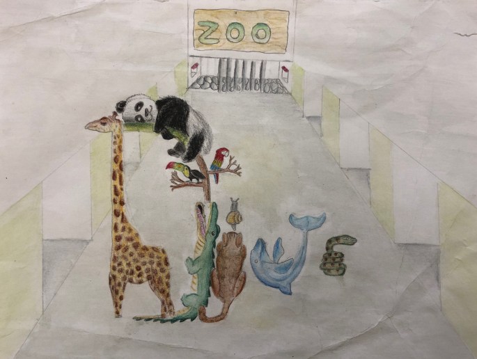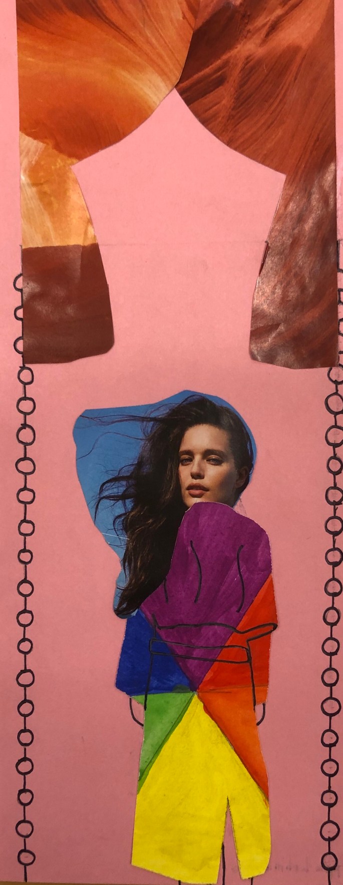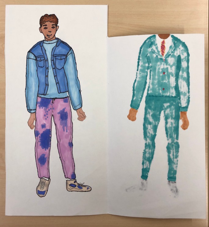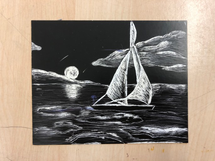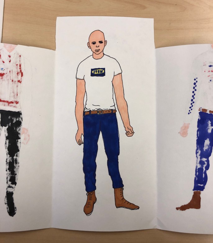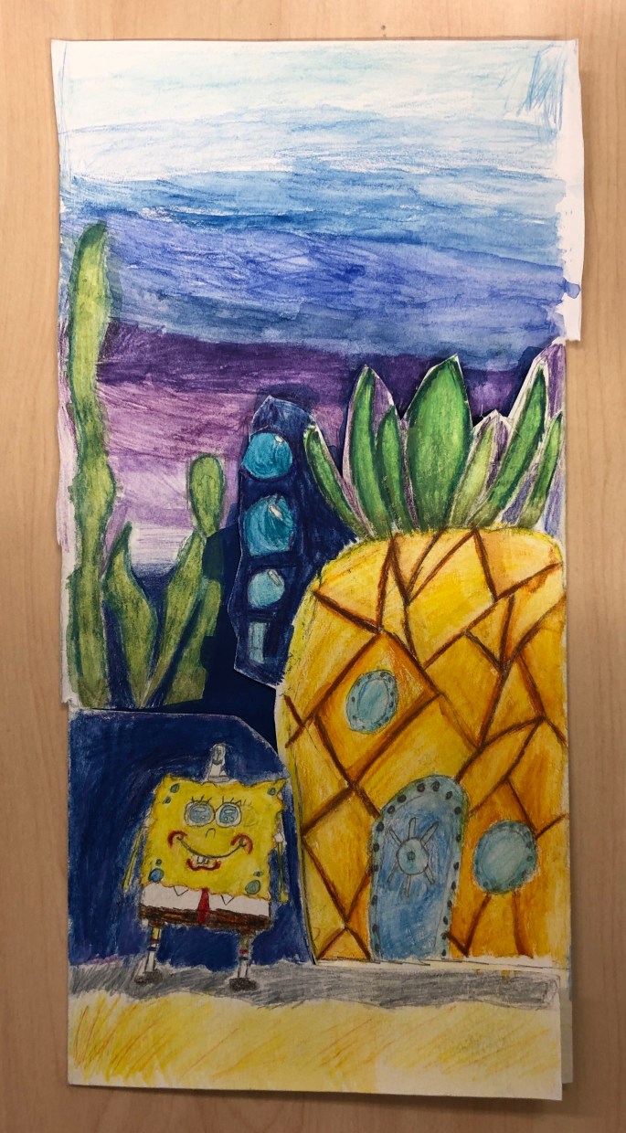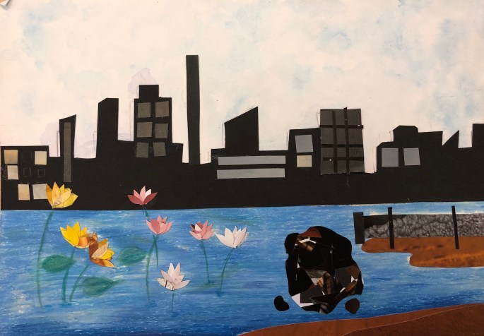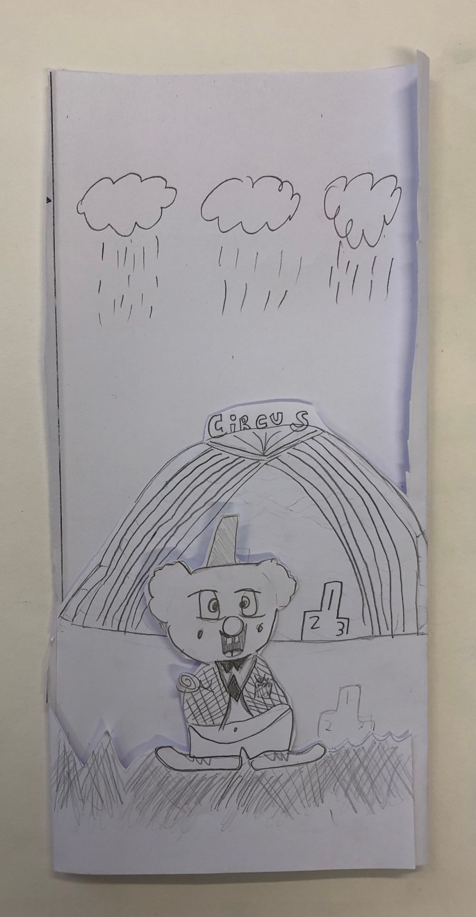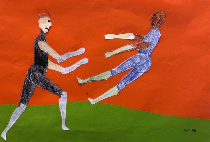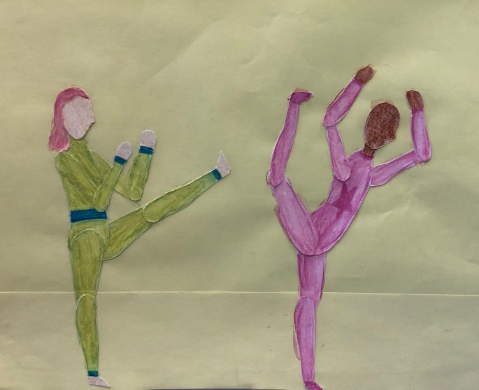 Vi har pratat om djup i bilder. De får välja ett tema tex rymden samt välja hur de ska gestalta en figur, något som växer och något som är byggt. Pappret viks i tre lika stora delar och det som inte behövs/döljer det bakom klipps bort. Vad ska vara i förgrunden? Mellangrunden? Bakgrunden?