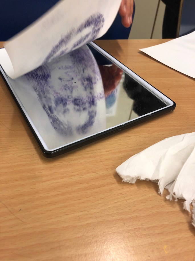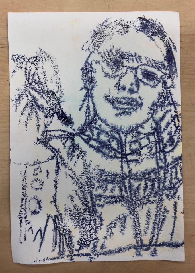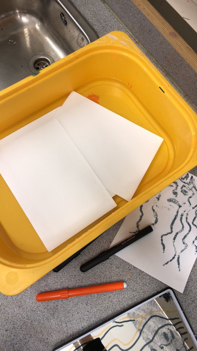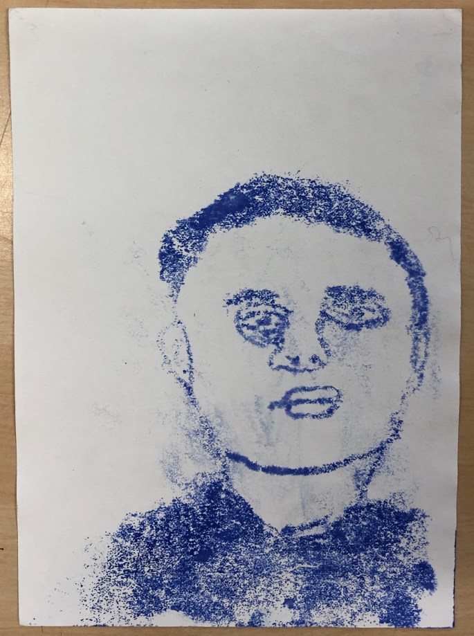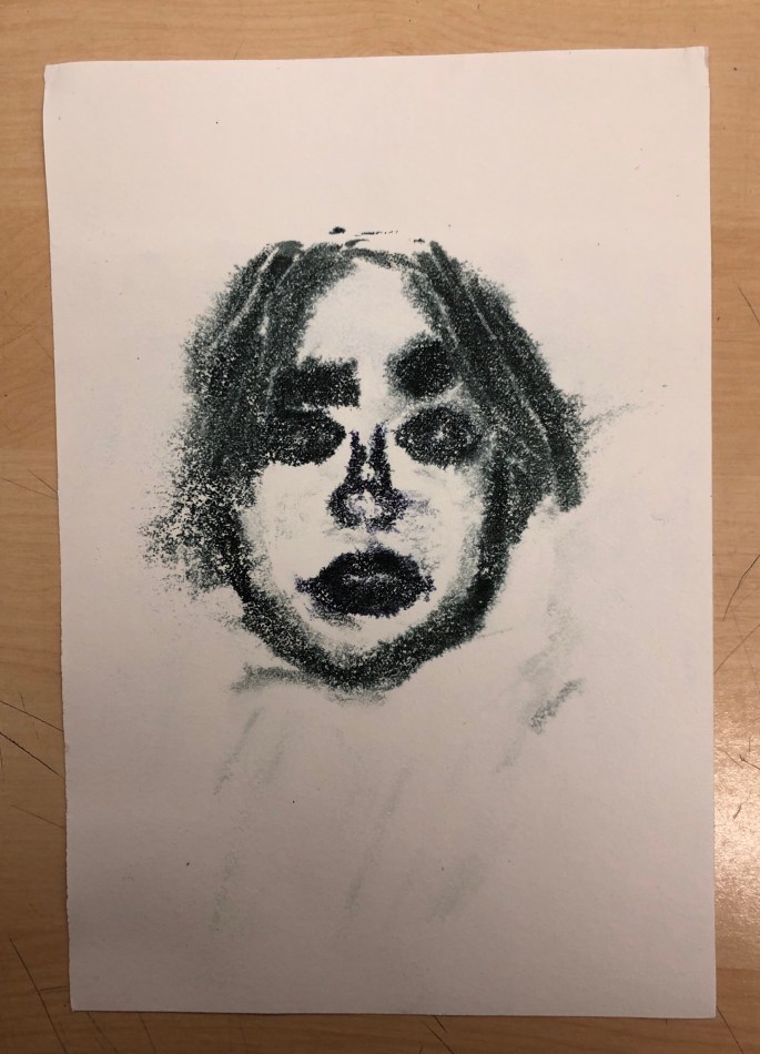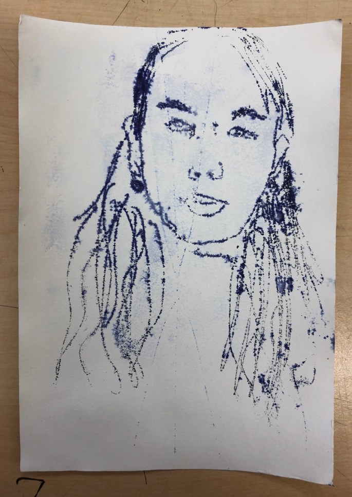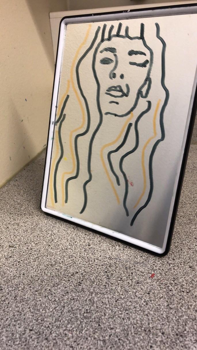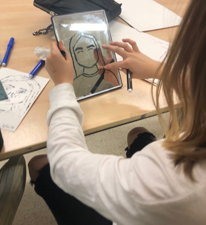 Min VFU-student Emma lär åk 6 att göra självporträtt genom spegeltryck. Följ efter linjerna du ser i spegeln, håll ena ögat slutet. Använd vattenlöslig tuschpenna. Tryck ett fuktigt papper mot spegeln och så har du ditt porträtt tryckt på papper!