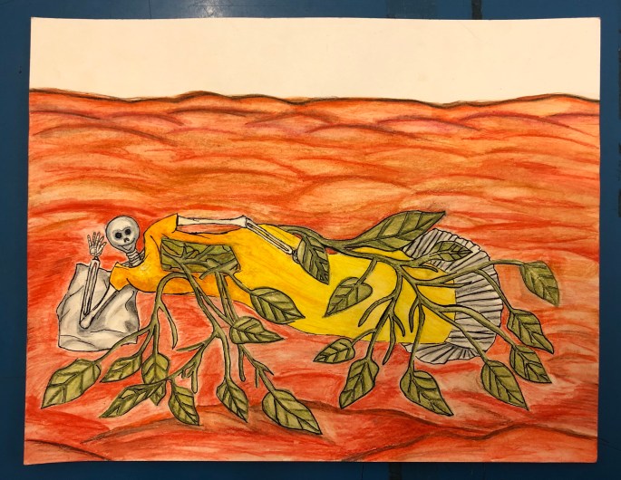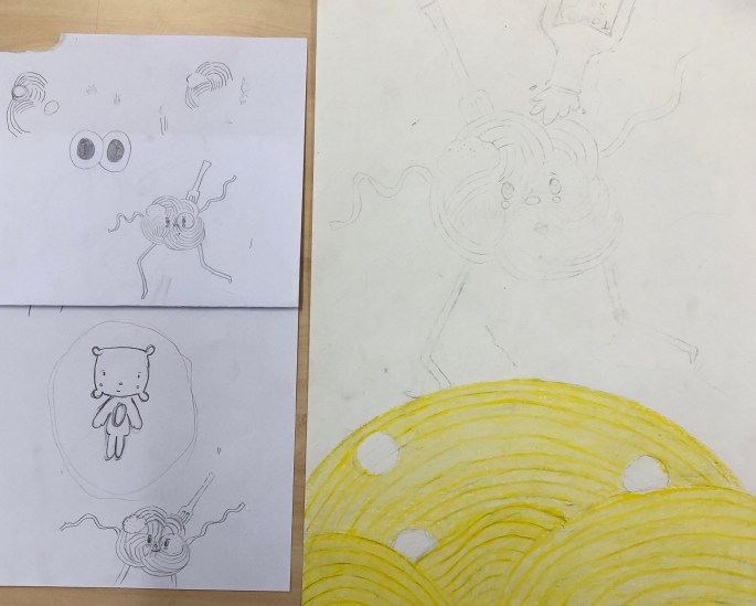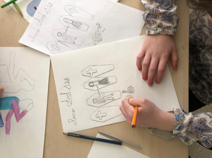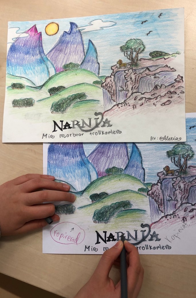 Här är min grymma VFU-student! Hon lär åk 5 om för-,mellan- och bakgrund. De ska ha med en figur, något byggt och något som växer. Det ska också finnas en stämning tex skräck. Här nedan kommer elevernas skisser.