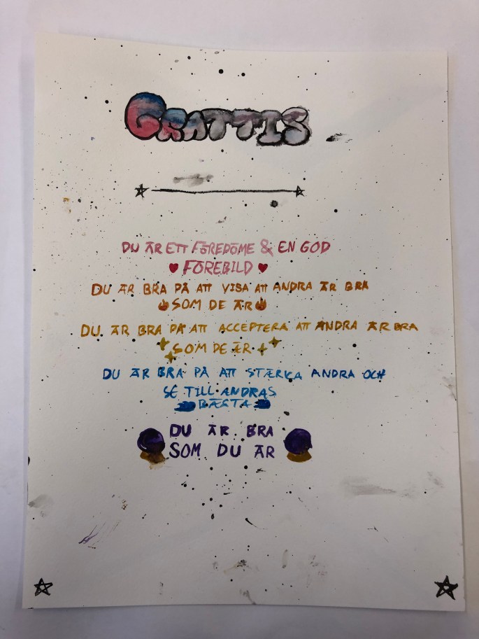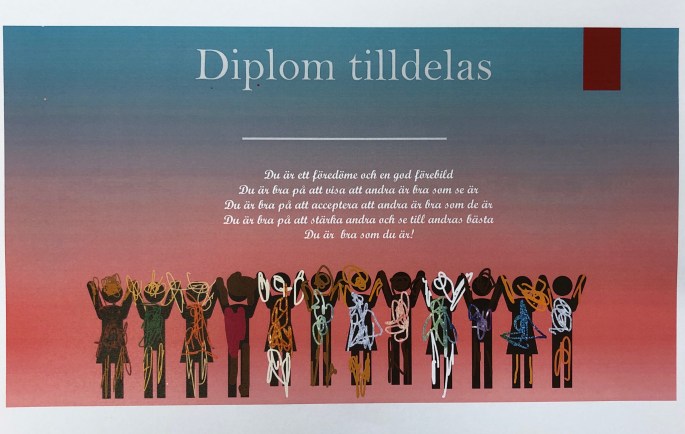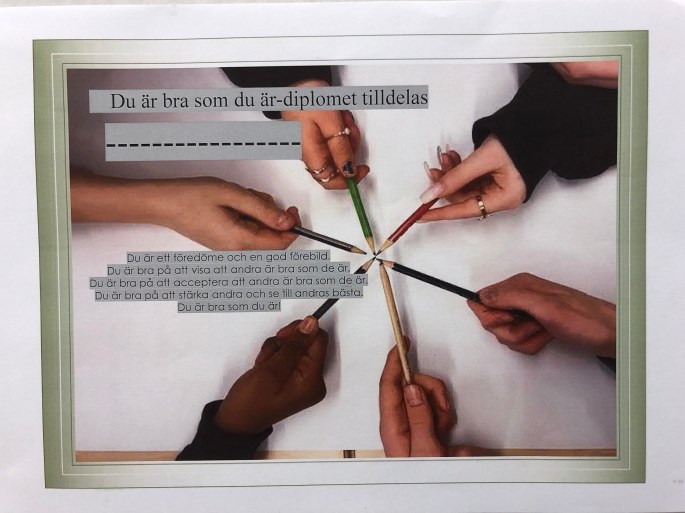 På skolavslutningen kommer rektor Tomas dela ut ett Du är bra som du är!-stipendium och nu jobbar 4BFD fram ett sådant. Vi har tittat på det som utmärker ett diplom och vad som måste vara med samt färger och former som passar!