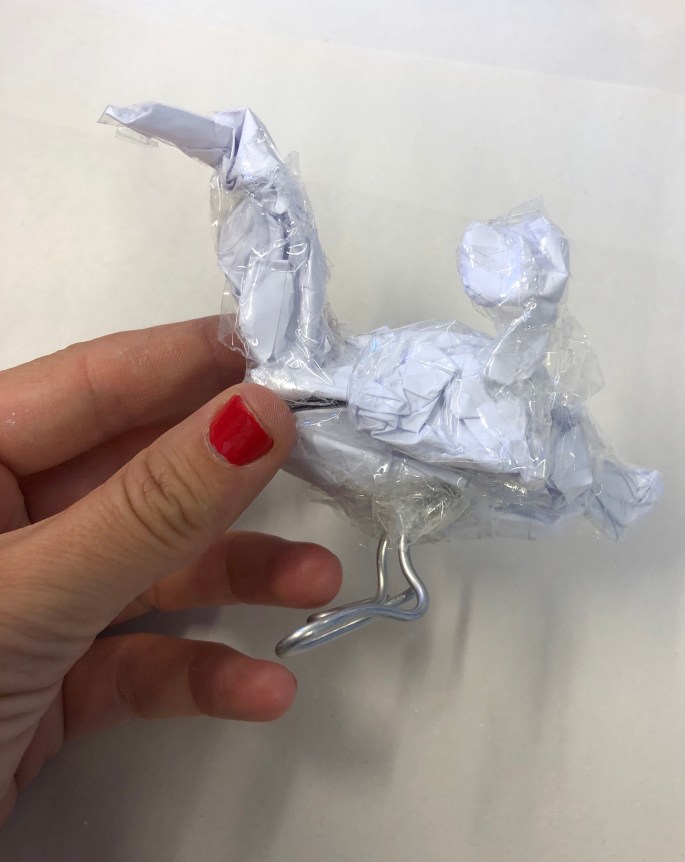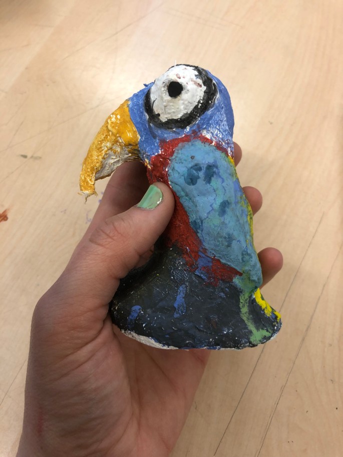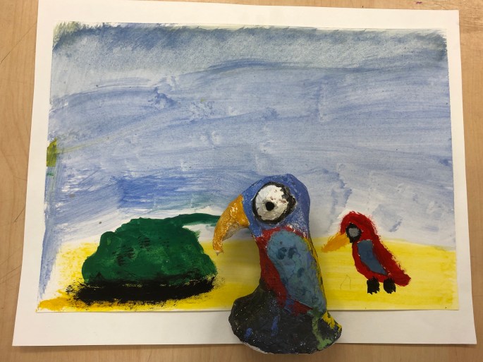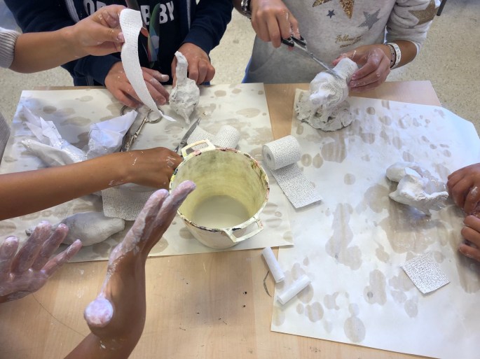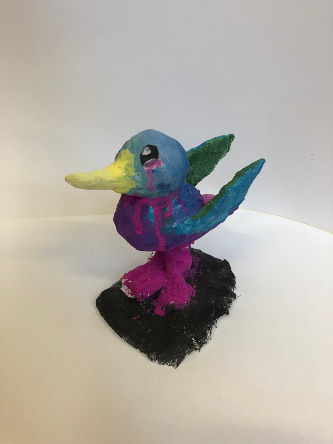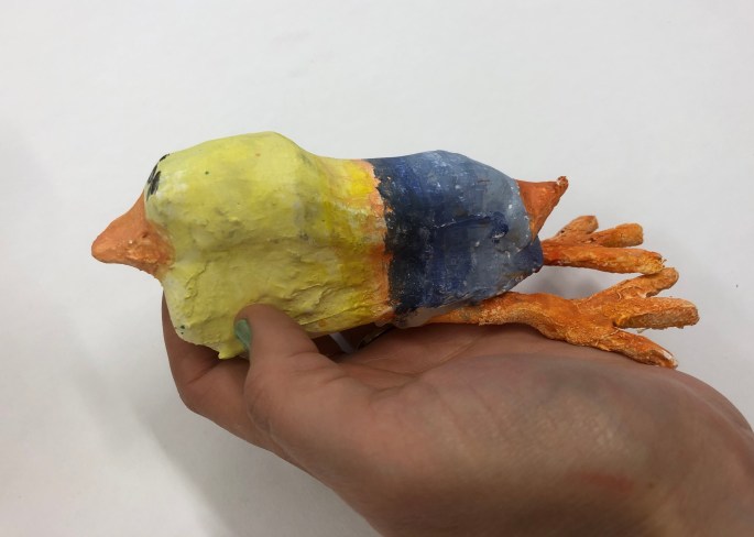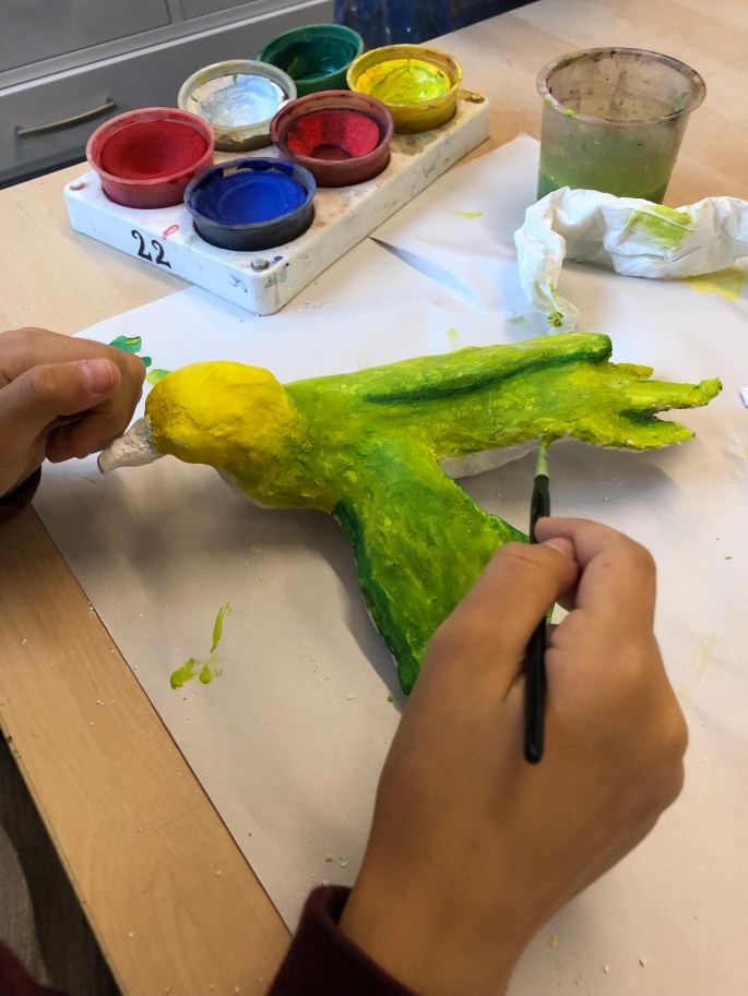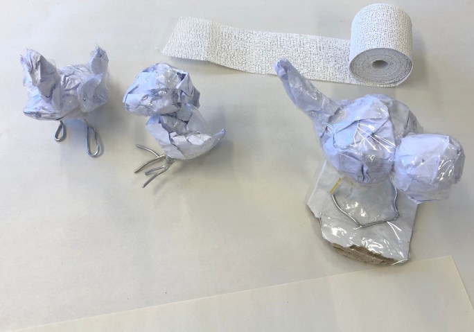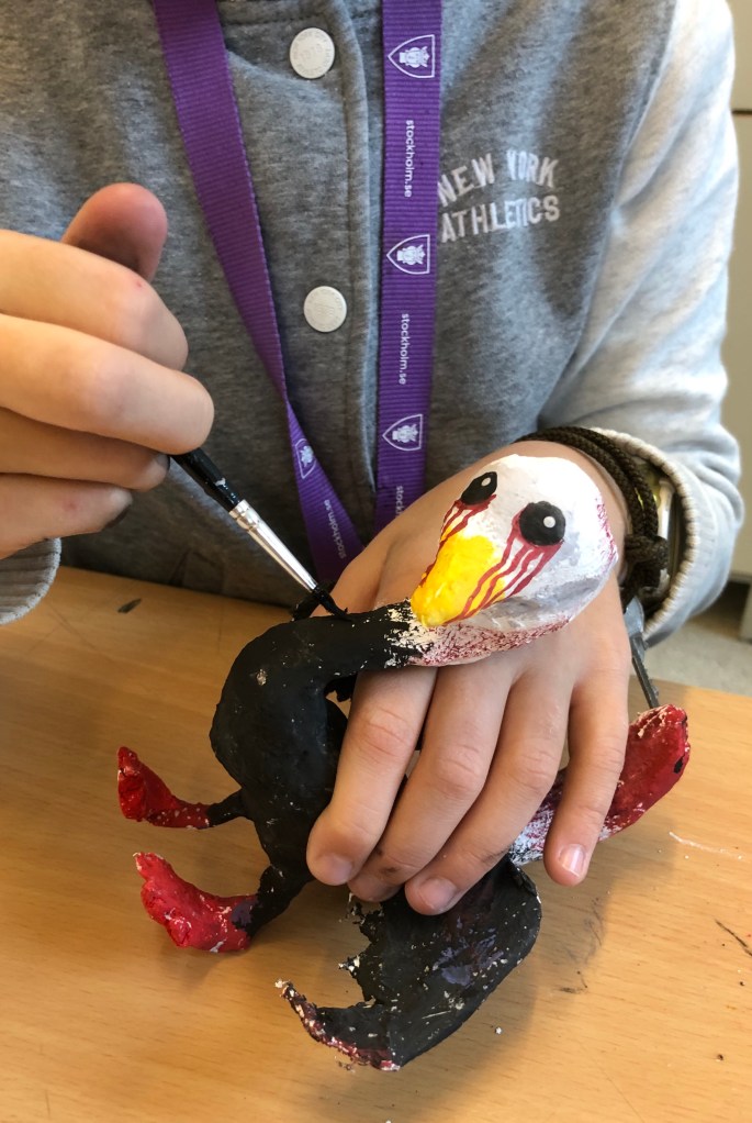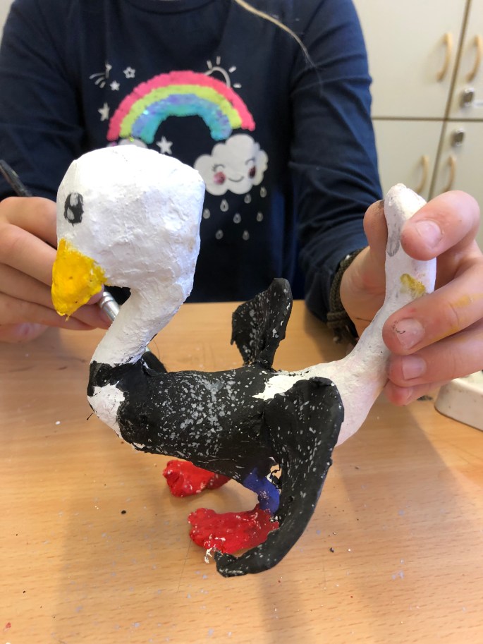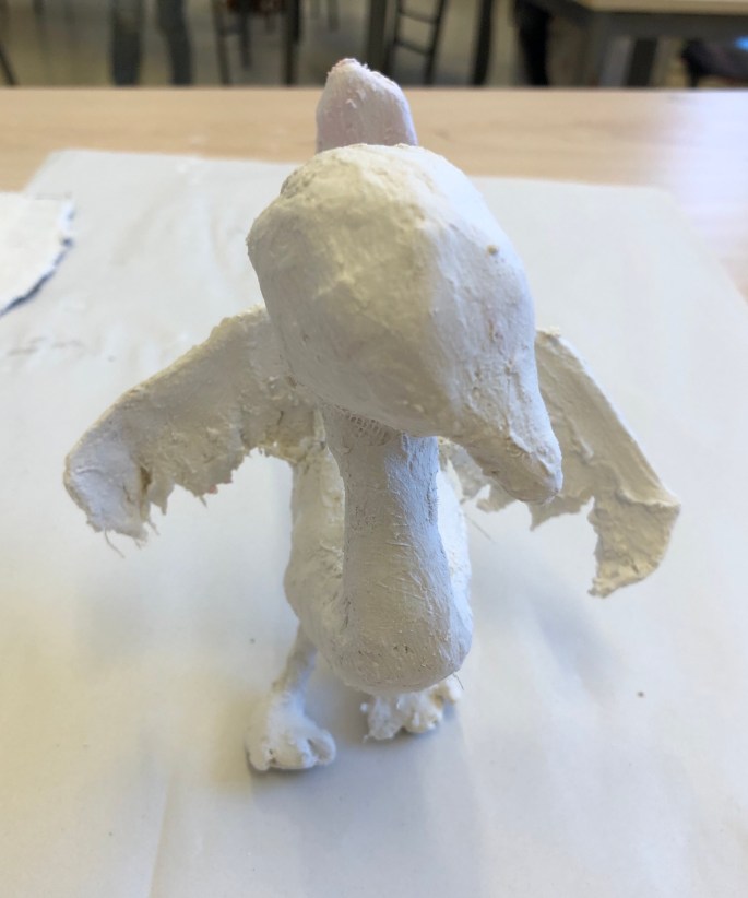 Vi har pratat om samt tittat på olika känslouttryck. Eleverna fick först skissa på fåglar med uttryck och gjorde sen en stomme av papper och tejp. Ovanpå det hamnar sen gipsbindorna innan det är dags för att måla.