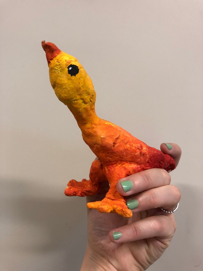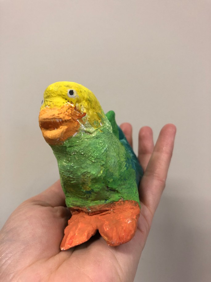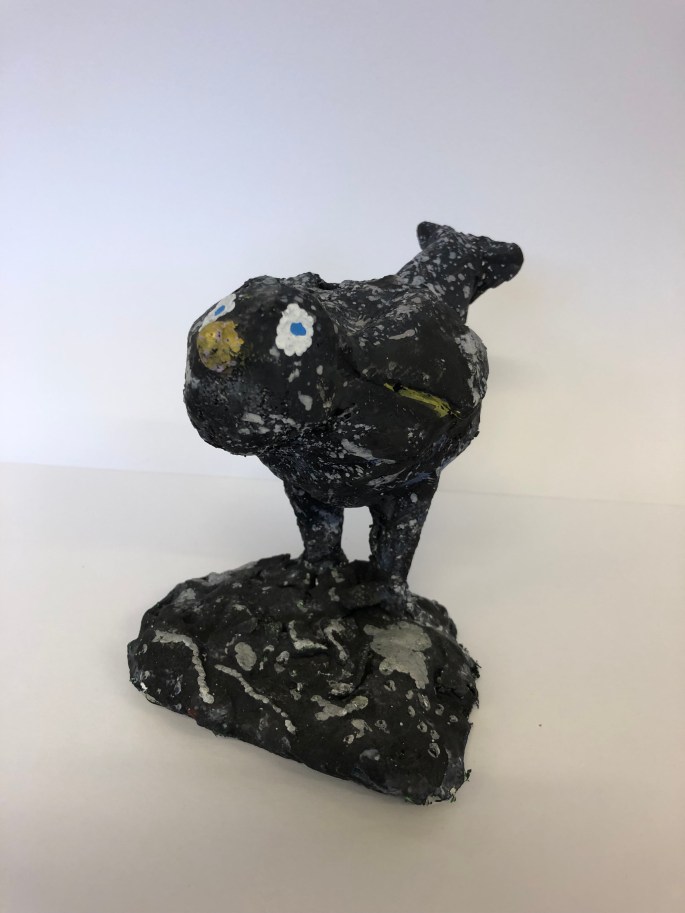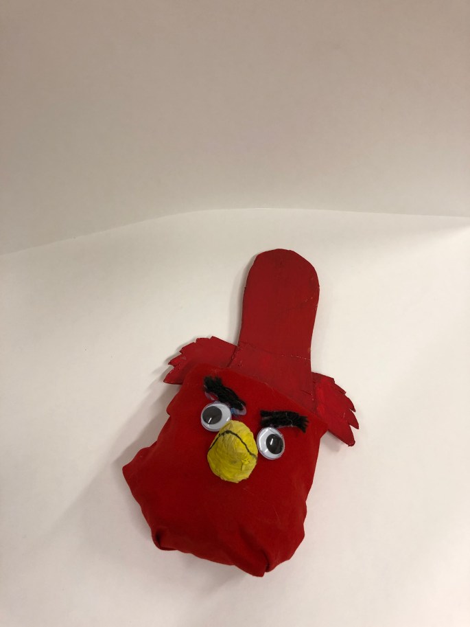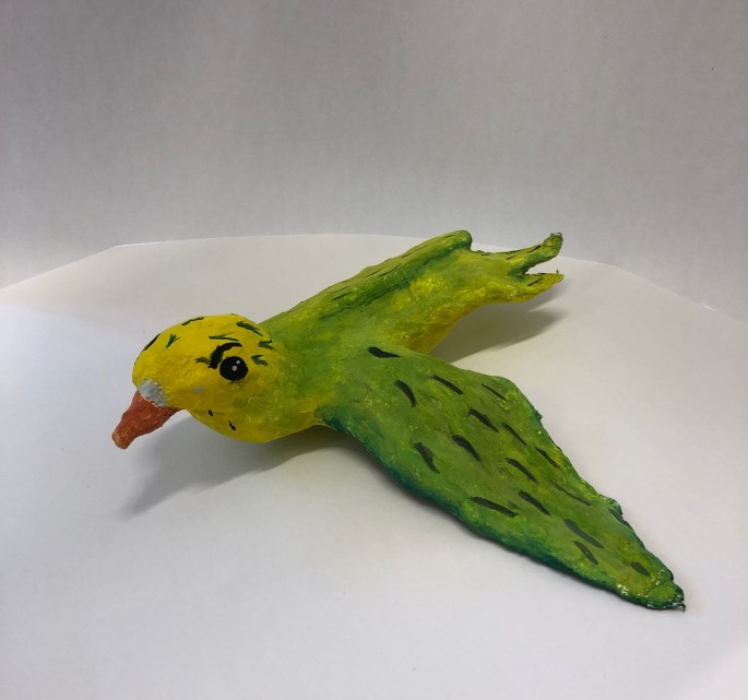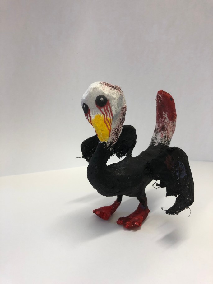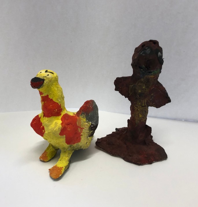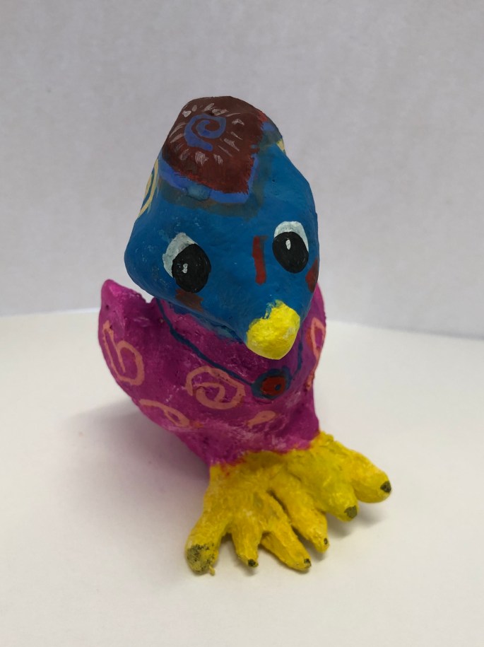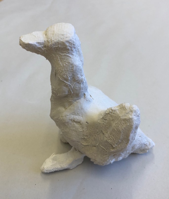 Vi har pratat om samt tittat på olika känslouttryck. Eleverna fick först skissa på fåglar med uttryck och gjorde sen en stomme av papper och tejp. Ovanpå det hamnar sen gipsbindorna innan det är dags för att måla.