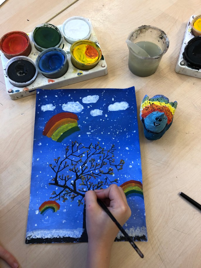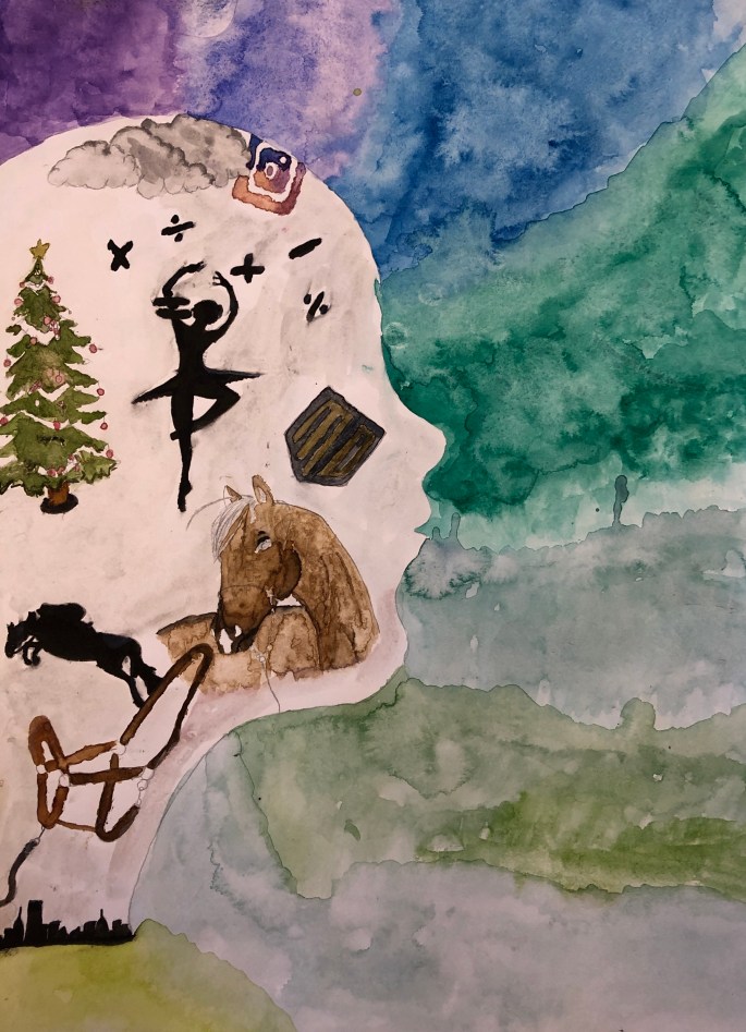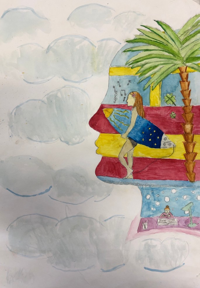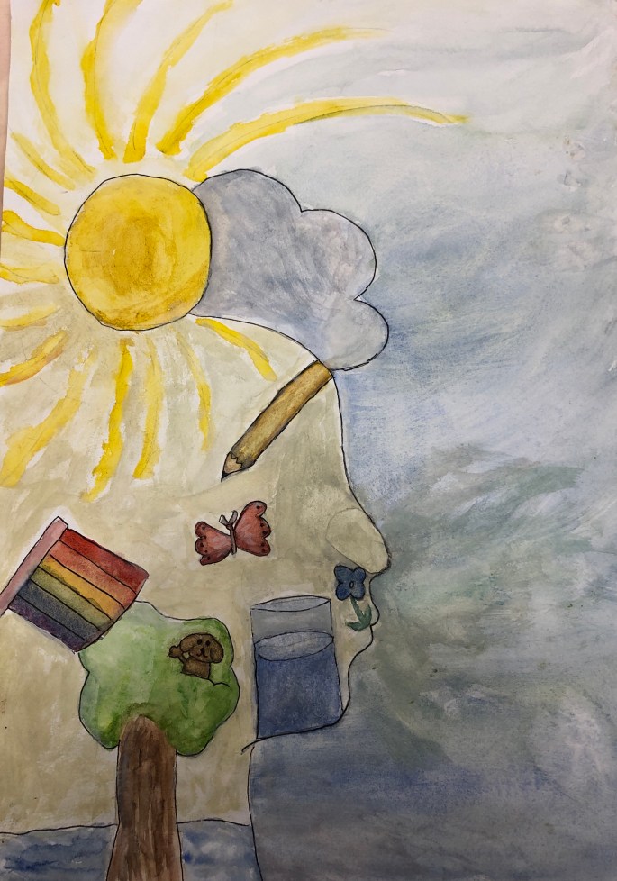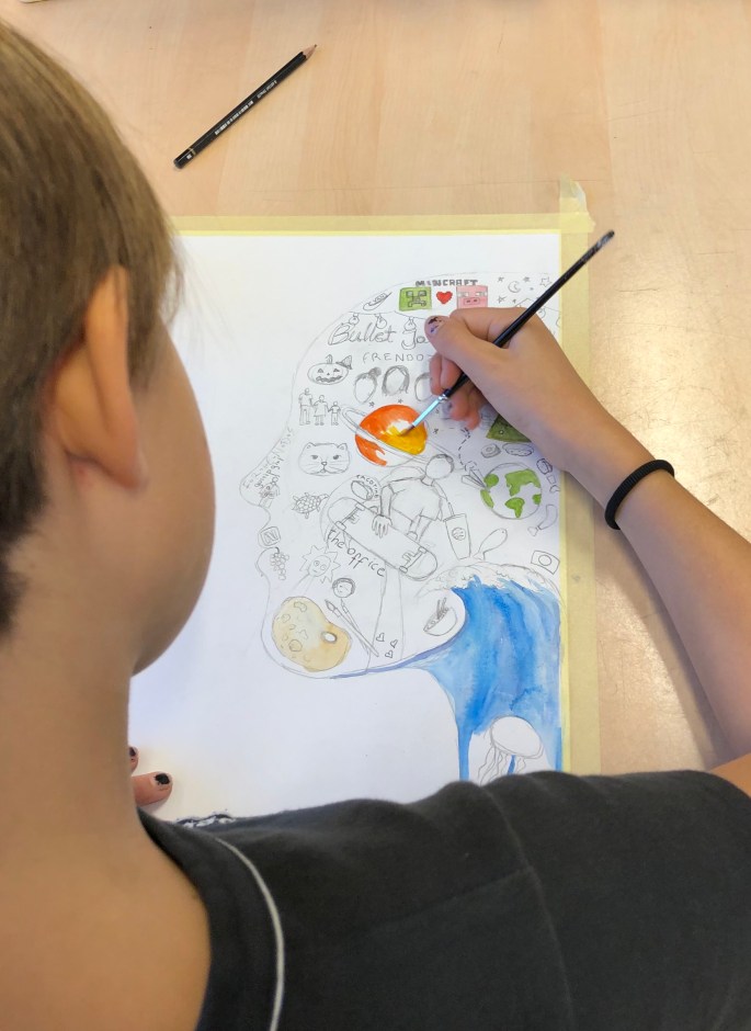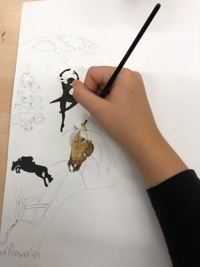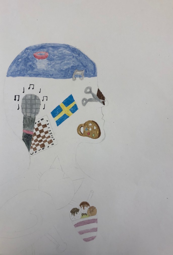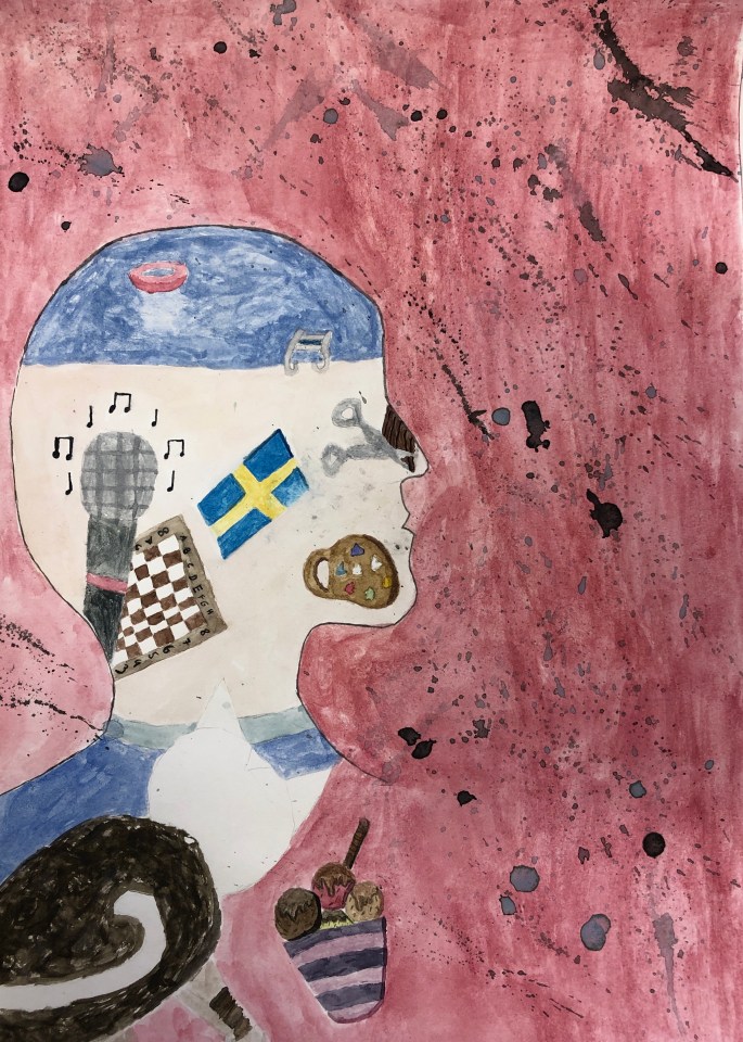 Nu är det dags att måla allt det som vi tecknat upp i huvudet! Vi har jobbat med bildkomposition och försökt placera ut allt det som ”händer i ens huvud” på bästa sätt. Vad ska vara stort/litet? Vad ska vara framför/bakom? Vad vill jag berätta om mig själv? Vem är jag och hur kan jag uttrycka det i denna uppgift?