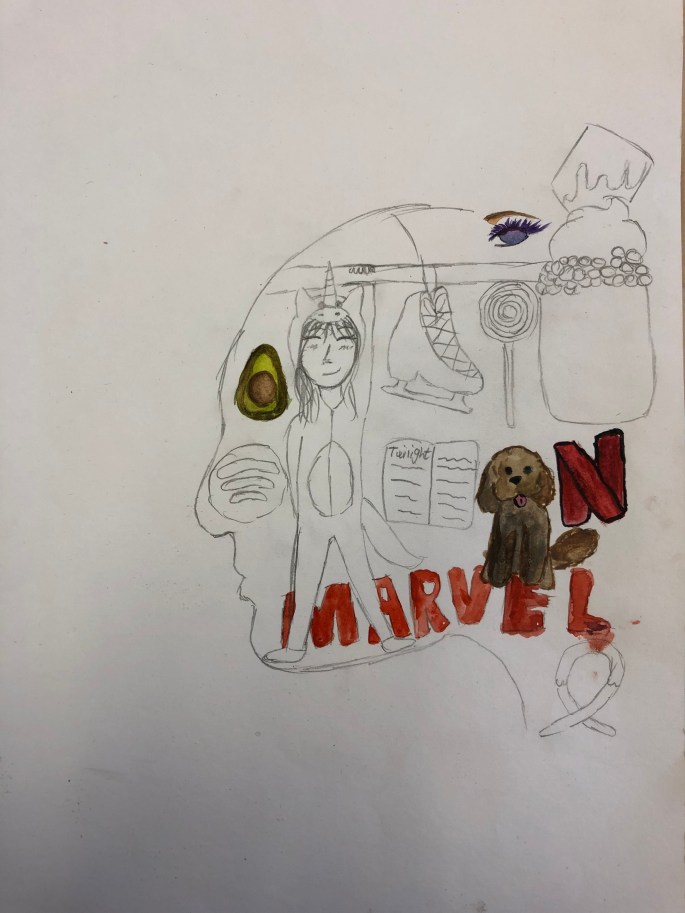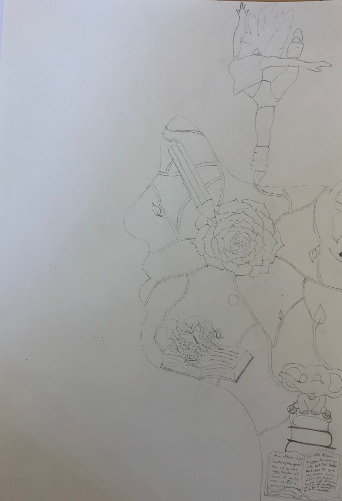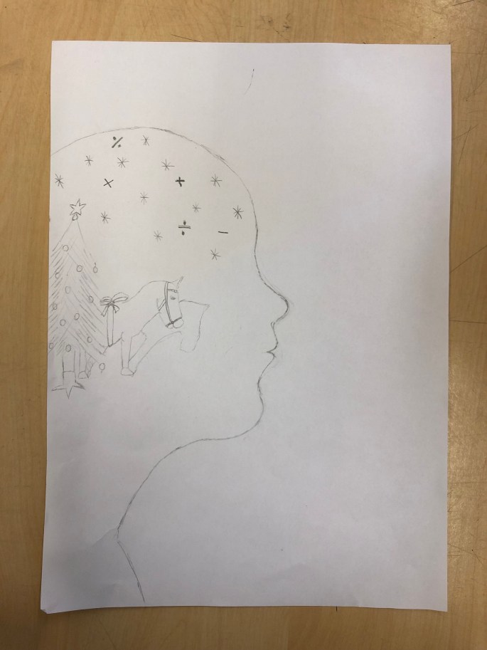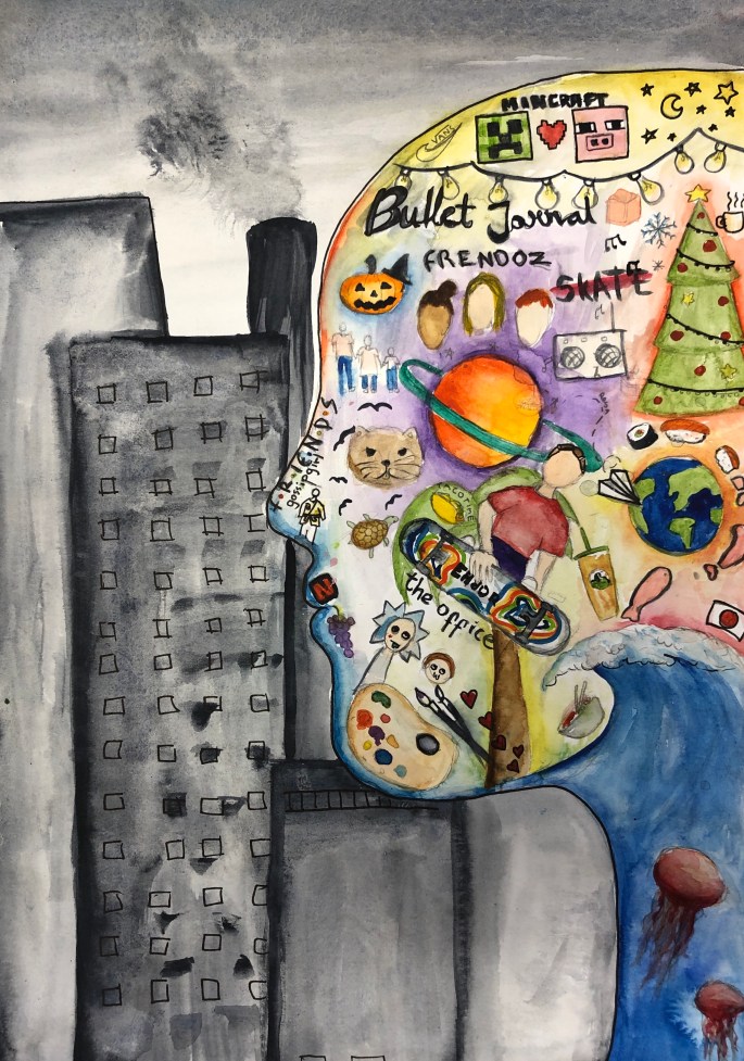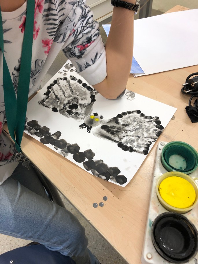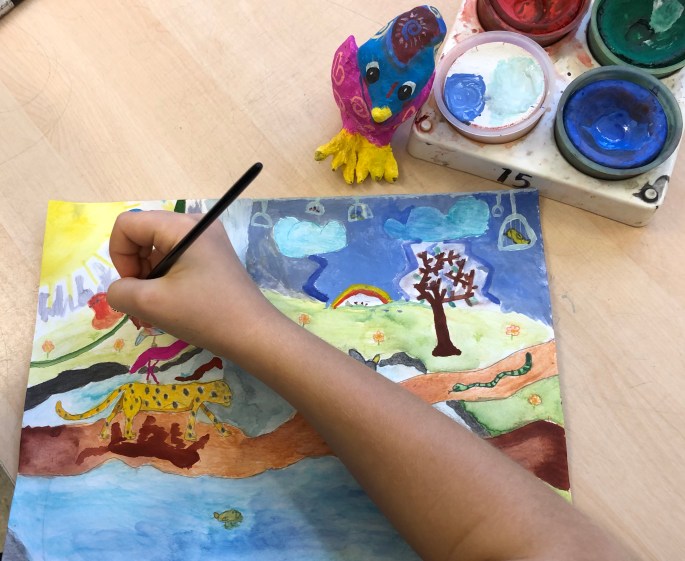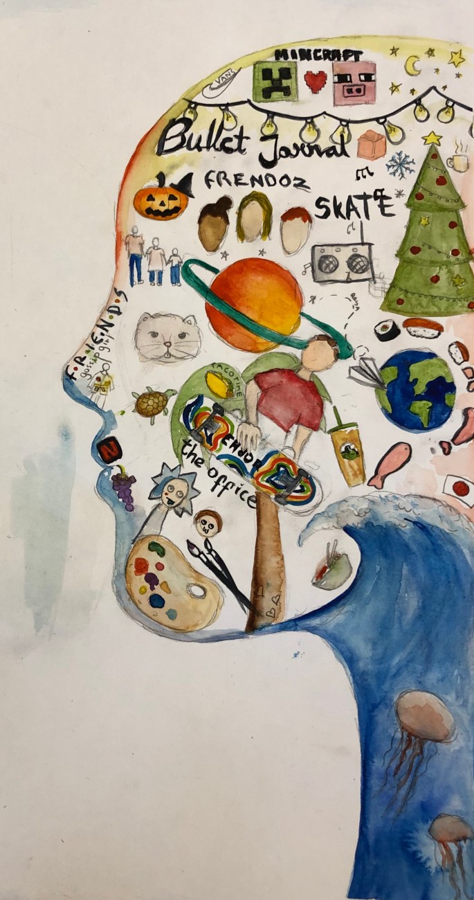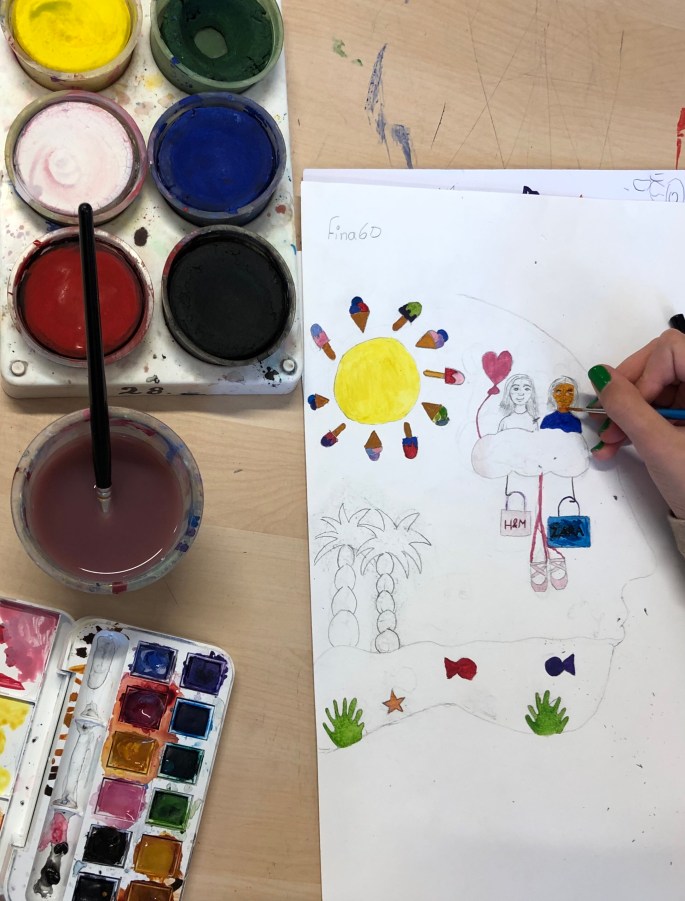 Nu är det dags att måla allt det som vi tecknat upp i huvudet! Vi har jobbat med bildkomposition och försökt placera ut allt det som ”händer i ens huvud” på bästa sätt. Vad ska vara stort/litet? Vad ska vara framför/bakom? Vad vill jag berätta om mig själv? Vem är jag och hur kan jag uttrycka det i denna uppgift?