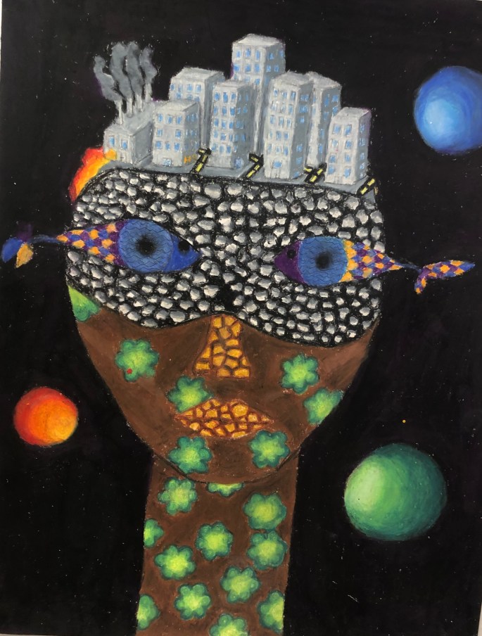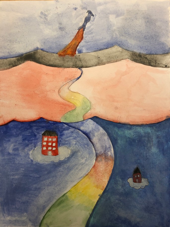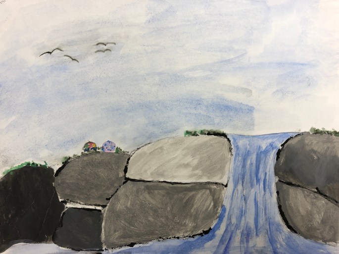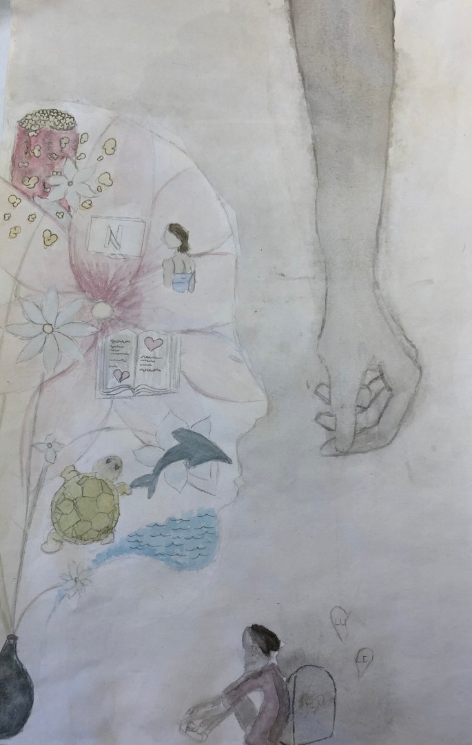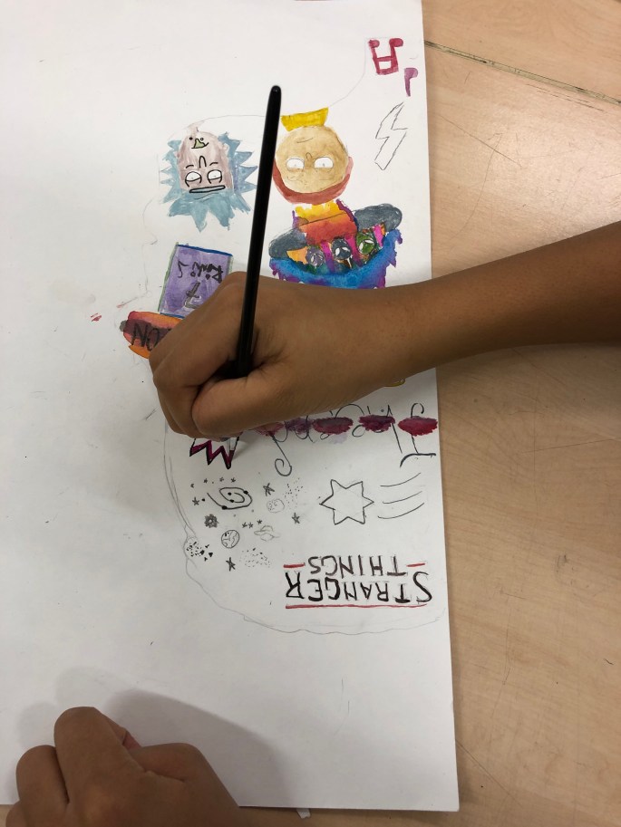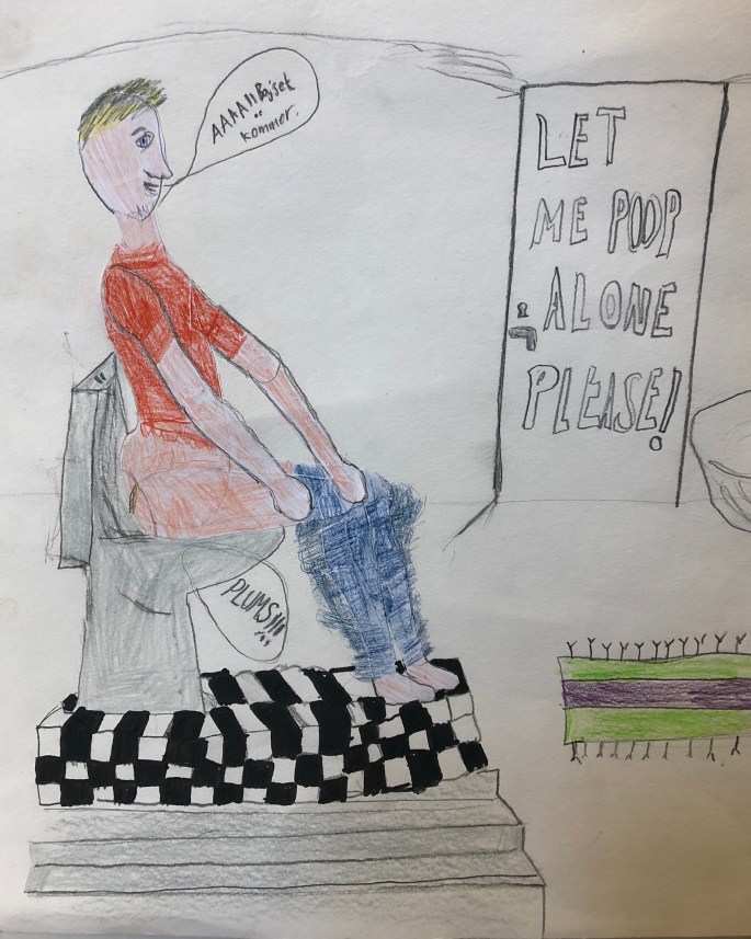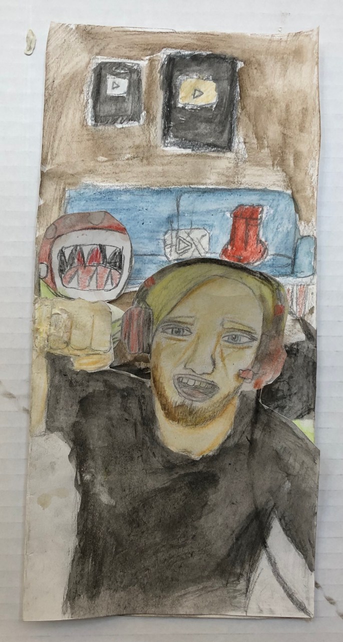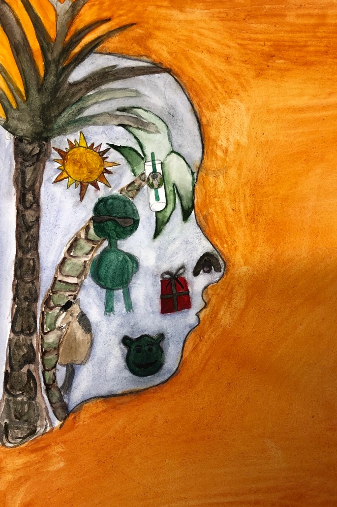 Nu är det dags att måla allt det som vi tecknat upp i huvudet! Vi har jobbat med bildkomposition och försökt placera ut allt det som ”händer i ens huvud” på bästa sätt. Vad ska vara stort/litet? Vad ska vara framför/bakom? Vad vill jag berätta om mig själv? Vem är jag och hur kan jag uttrycka det i denna uppgift?