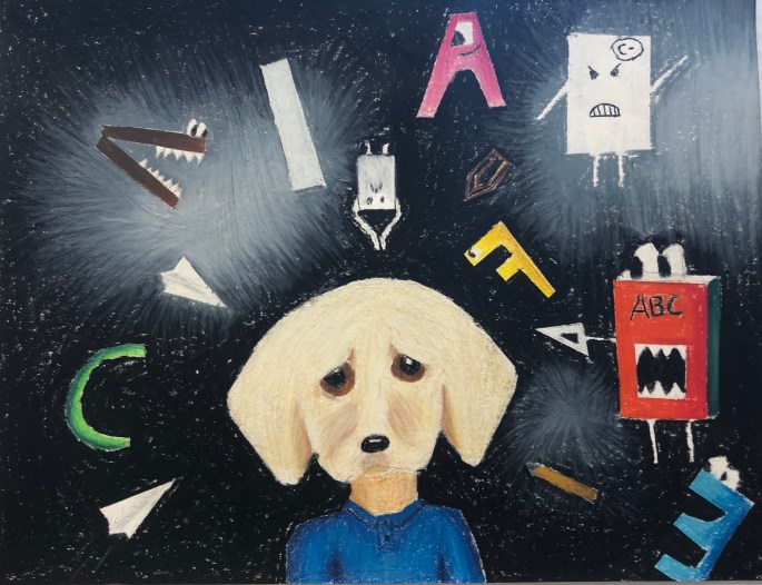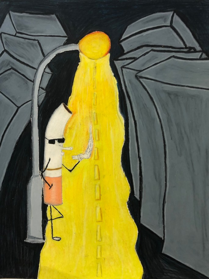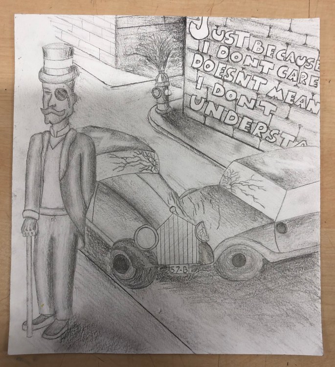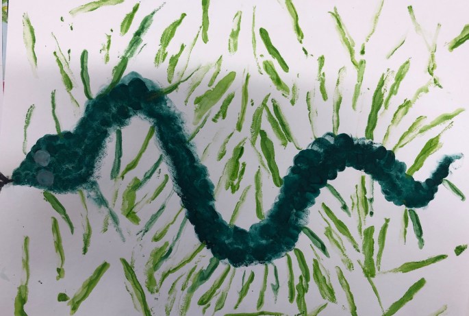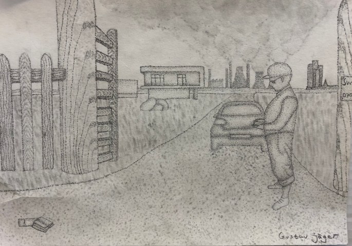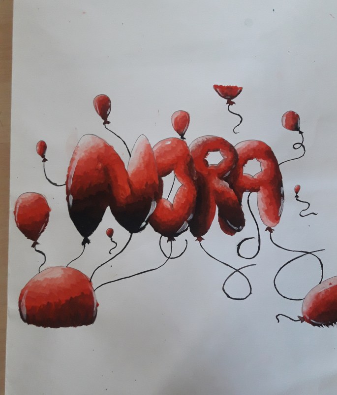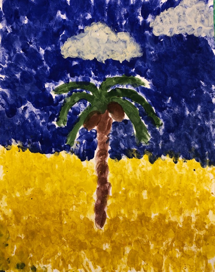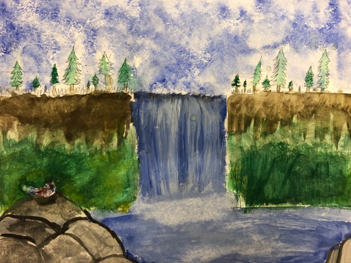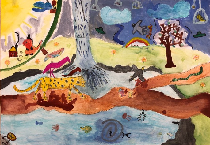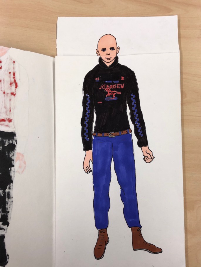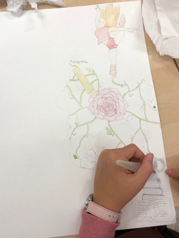 Nu är det dags att måla allt det som vi tecknat upp i huvudet! Vi har jobbat med bildkomposition och försökt placera ut allt det som ”händer i ens huvud” på bästa sätt. Vad ska vara stort/litet? Vad ska vara framför/bakom? Vad vill jag berätta om mig själv? Vem är jag och hur kan jag uttrycka det i denna uppgift?