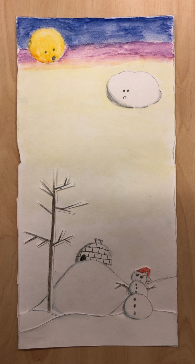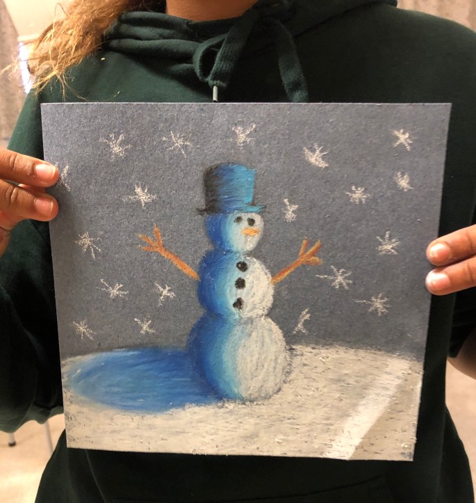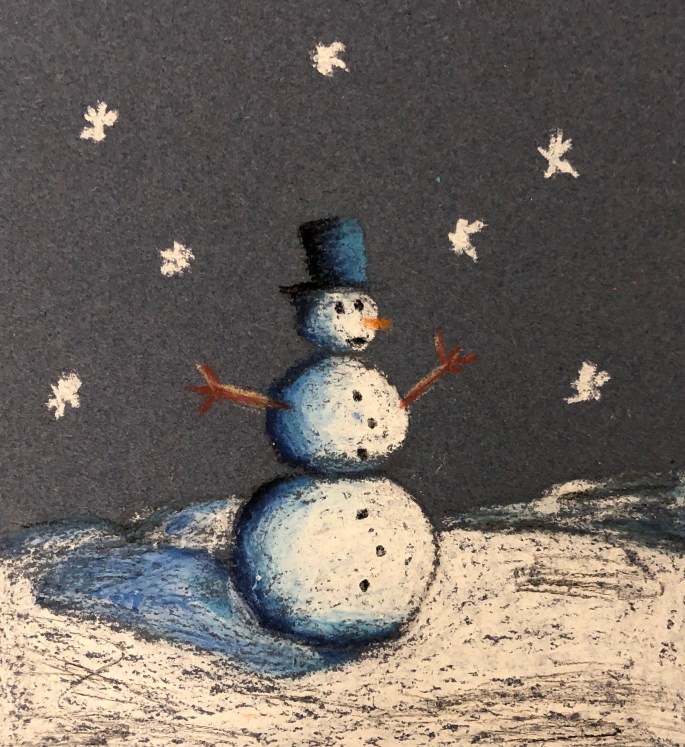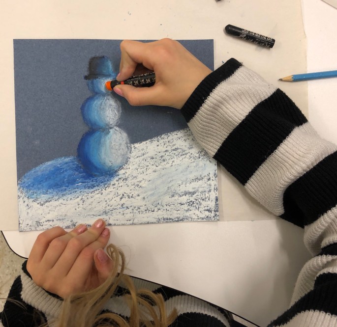 Sista lektionen så tog vi fram oljepastellkritorna och följde efter ”Snögubbe i natten” på youtube. Trots samma instruktioner så blir alla snögubbar unika.