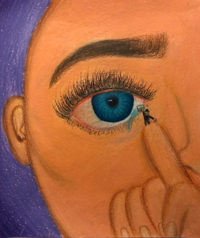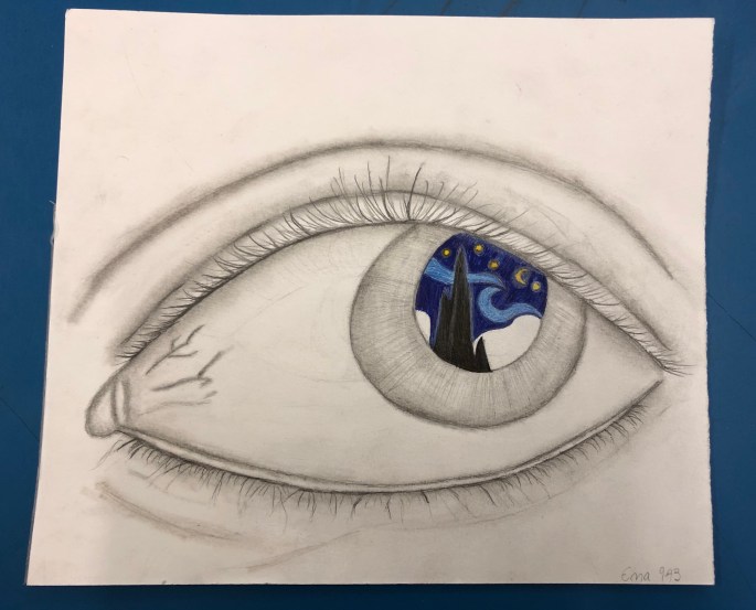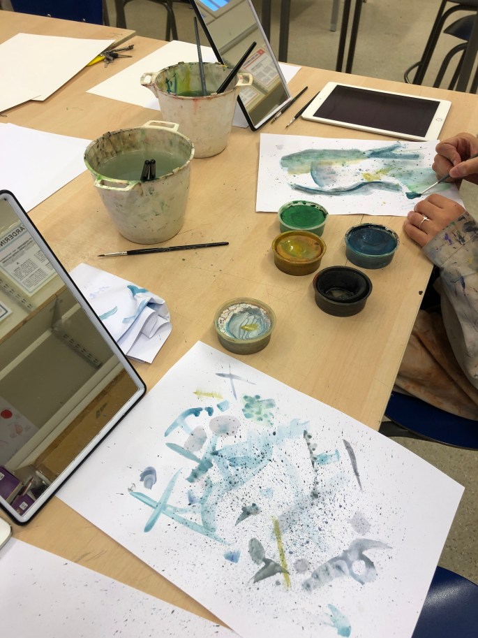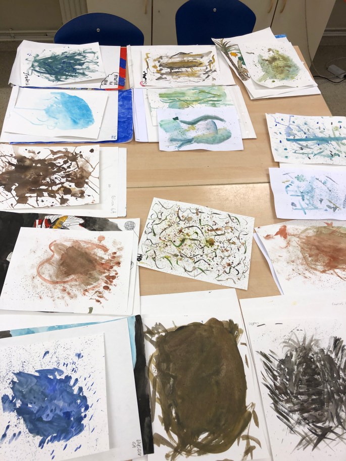 Vi studerade våra ögonfärger i en spegel eller foto. Det skulle sen bli en abstrakt bild med variation tex korta/långa penseldrag, prickar,skvätt osv. Att måla abstrakt är svårare än vad man tror.
