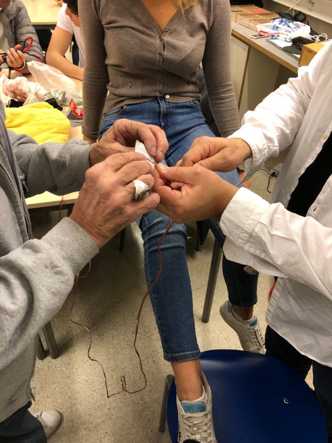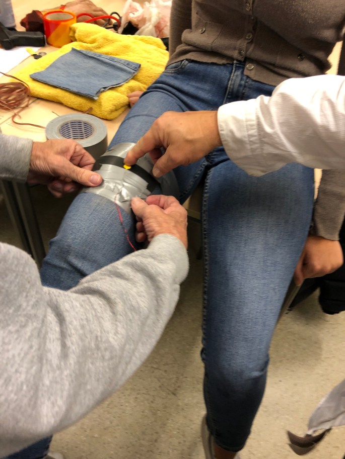 Här visas bland annat Alexander Skarsgårds fejkhand upp tillsammans med Hollywood dust, silikonglas och ett antal knivar och vapen. Allt är fejk såklart men ser äkta ut på film. Vi laddar en elev med en squibb så att det ser ut som ett pistolskott träffar i benet. Squibben smäller högt och trasar sönder jeanstyget, som är lagt överst, med bland annat gummibitar som skydd mot kroppen.