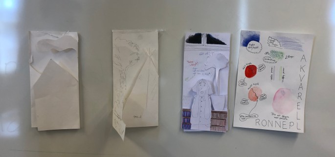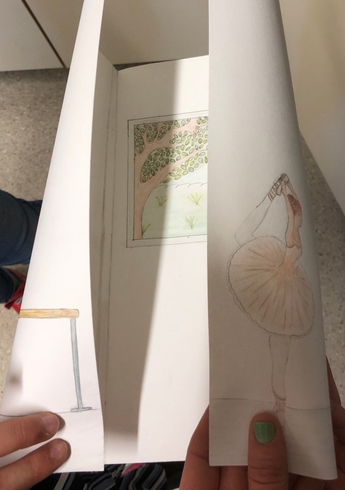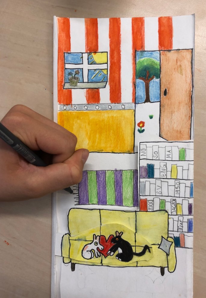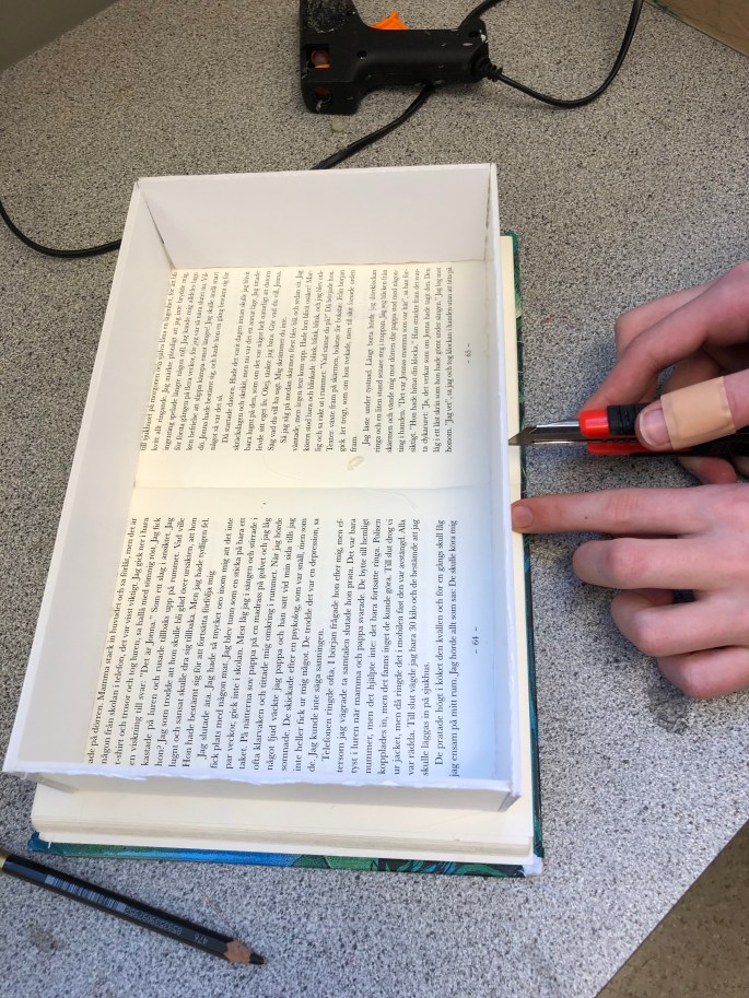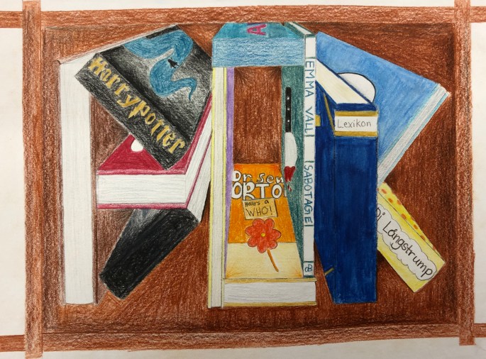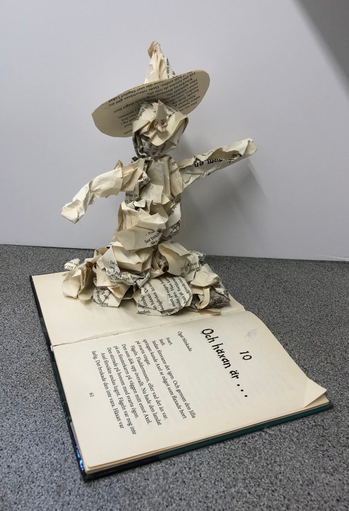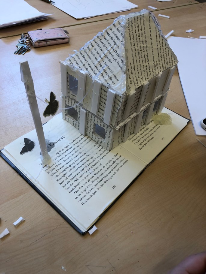 Vi har fått utgallrade böcker av biblioteket. Böckerna ska nu få liv genom att ”byggas” ut av självaste sidorna i boken. Eleverna utgår ifrån bokens titel, handling eller illustrationer.
