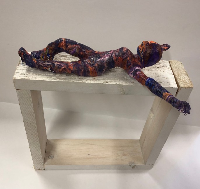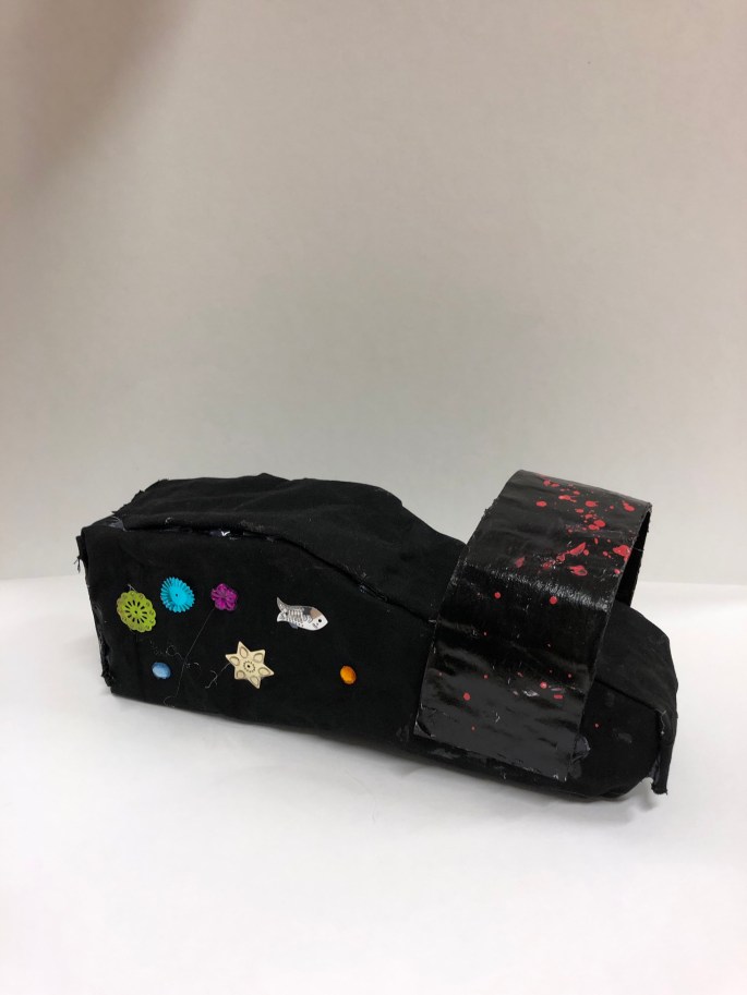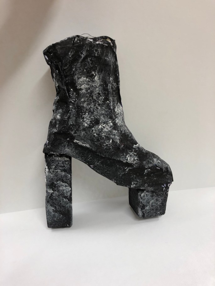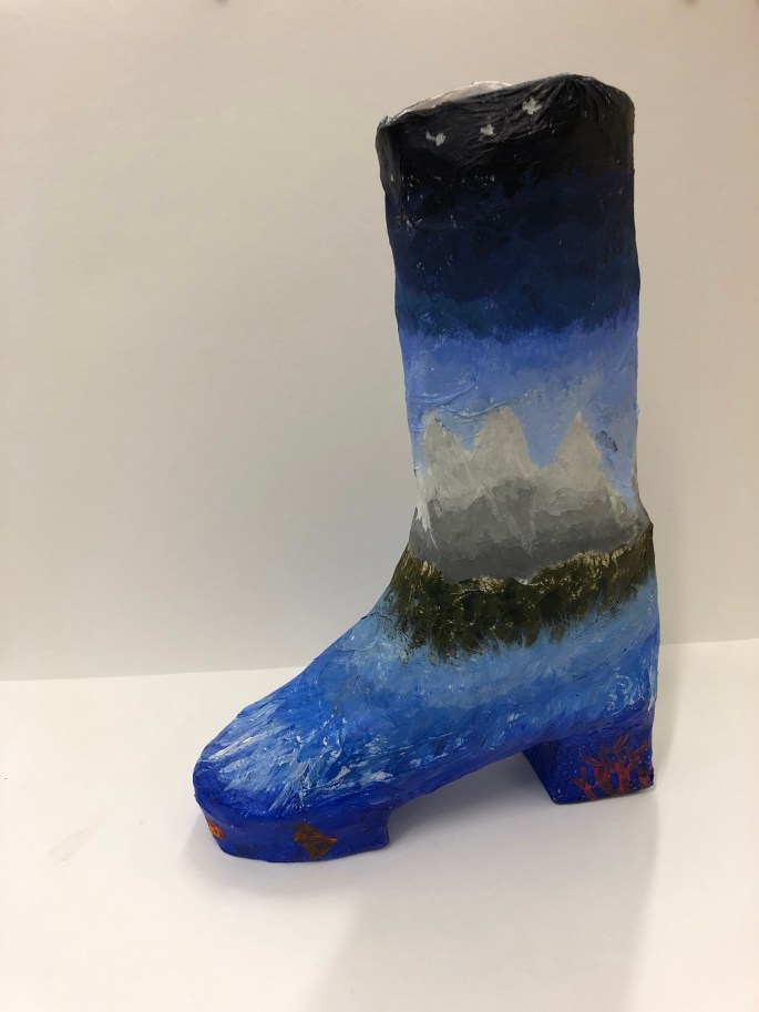 Stöveln nedan är byggd av kartong, hönsnät och papiermache.