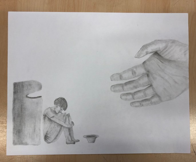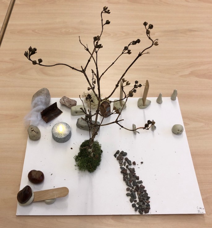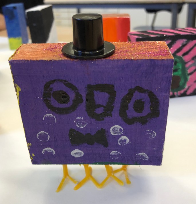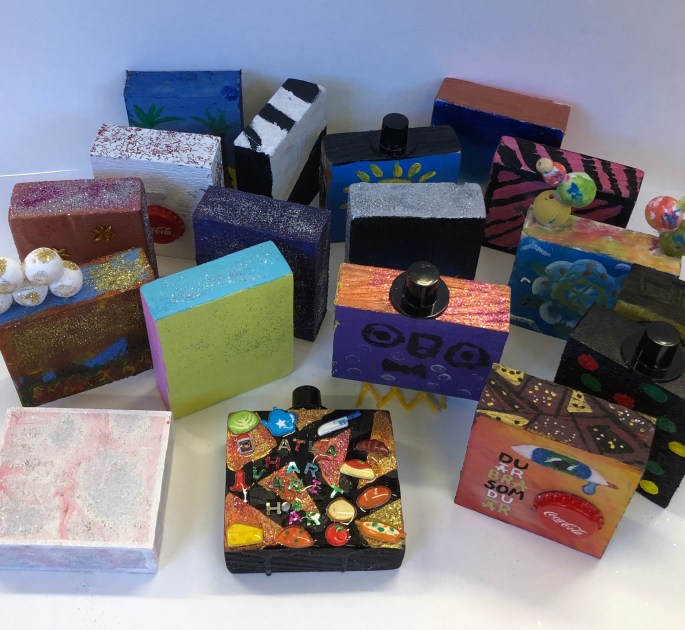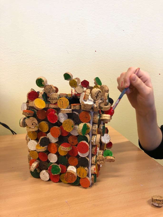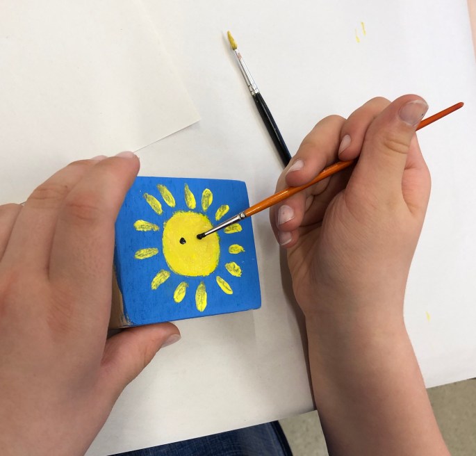 Vi har tittat på verket 17000 som ställdes ut på Liljevals 2019. Varje träbit är lika stor men varierar i uttryck. Tillsammans står de för budskapet varje person är unik av de 17000 ensamkommande som inte fick stanna i Sverige. Vi har inspirerats av verket och med hjälp av varsin träkloss så visar vi på att vi är bra som vi är, unika och att det bara finns en, och att vi har vår gemenskap.