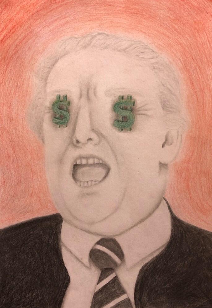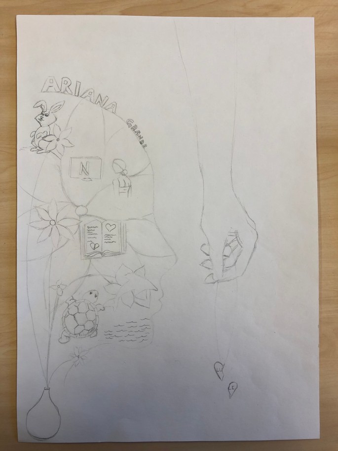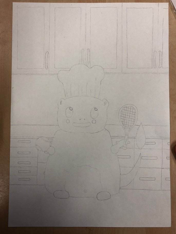 Först skissa på skisspapper. Sen förstora i kopiatorn. Sen kalkera på A3 från förstoringen.