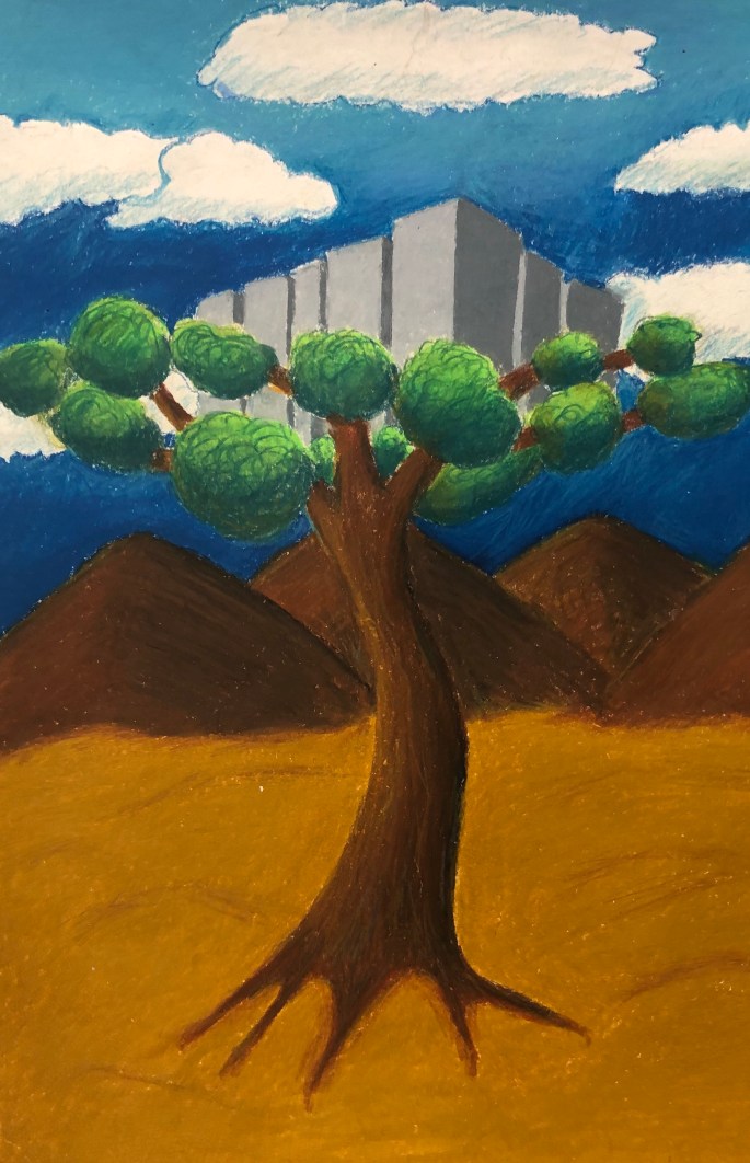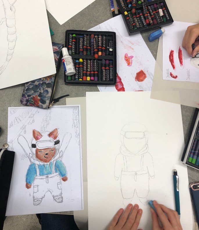 Nu har vi snart skissat klart och ska börja rita upp på A3. Vi testar oljepastellen.