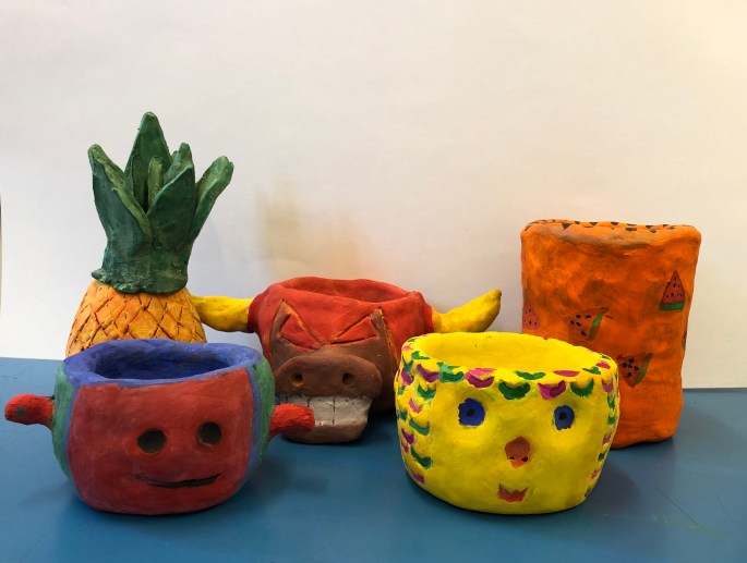 Casper och Nora gör en ljusstake och ett lerhuvud som extrauppgift när vanliga bilduppgifter och filmerna är klara.