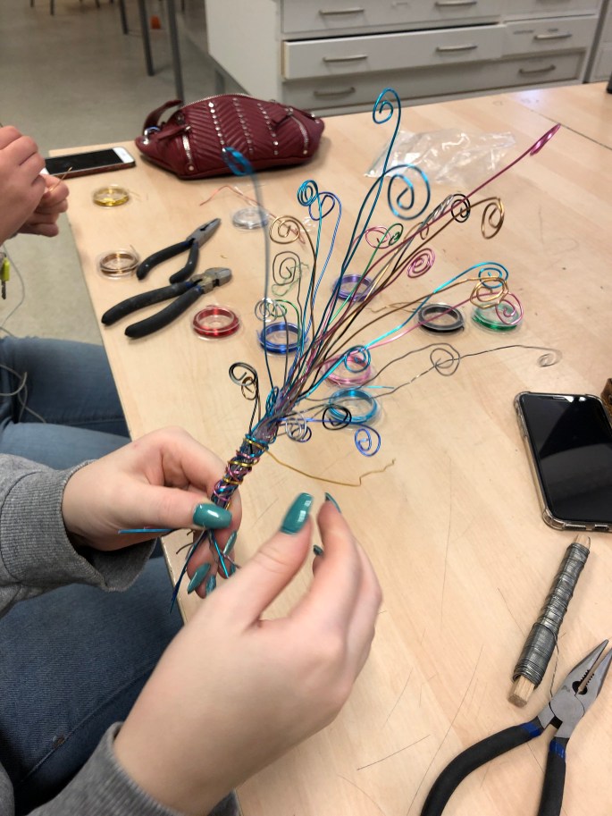 Medan den ena halvan är i bildsalen och designar skor så är den andra i trä- och metallslöjden. Här ska det skapas väggklockor!