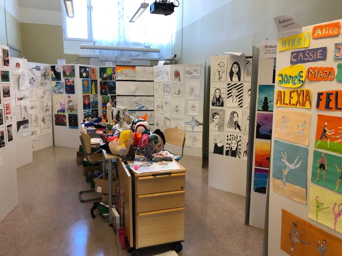 Delar av utställningen v20 fanns i lilla rummet bredvid bildsalen. Jag ”satte ihop” en mini-utställning för dem. Vi kunde konstatera att bildundervisningen ser olika ut emellan våra länder.