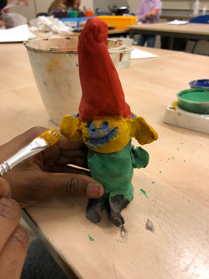 Vi har jobbat med lera och testat olika tekniker (tumning, kavling, ringning samt slickers). Vi gjorde tomtar och sen förvaringsskålar.
